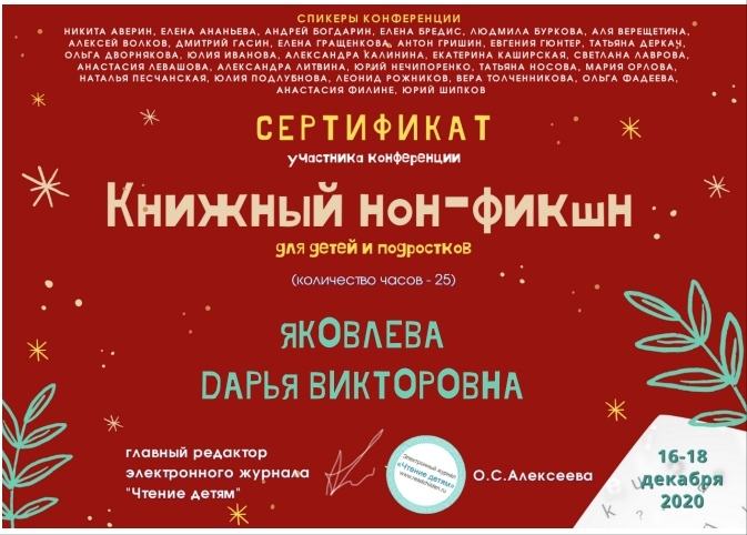 В декабре 2020 года студенты  групп  9Б-21-19(22),9Б-31-18(21) специальности «Библиотековедение» Колледжа БГПУ им. М.Акмуллы и методист Гафарова Л.В. приняли участие в онлайн-конференции "Книжный нон-фикшн для детей и подростков", которая была организована электронным журналом «Чтение детям»(http://www.readchildren.ru). Основными темами конференции были: