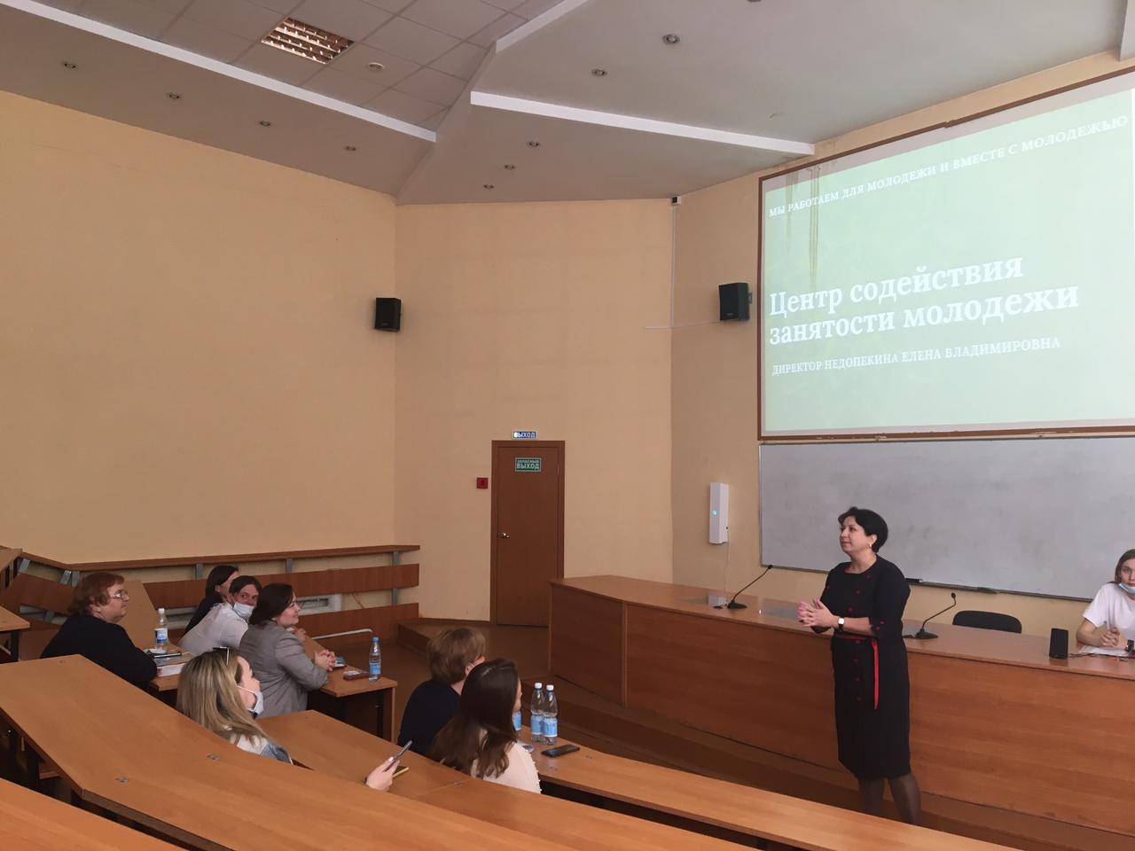 Первым спикером на данном мероприятии была директор МБУ «Центра содействия занятости молодежи» города Уфы Елена Владимировна Недопекина. В ходе своего выступления она рассказала об основных направлениях работы деятельности Центра. «Центр содействия занятости молодежи» работает по направлениям: «Молодежная биржа труда»; «Мероприятия по трудоустройству»; «Профориентационная работа с молодежью». Студентам предложили стать волонтерами на ближайшем мероприятии города «VI Всемирная Фольклориада -2021CIOFF» и активно сотрудничать с Центром.