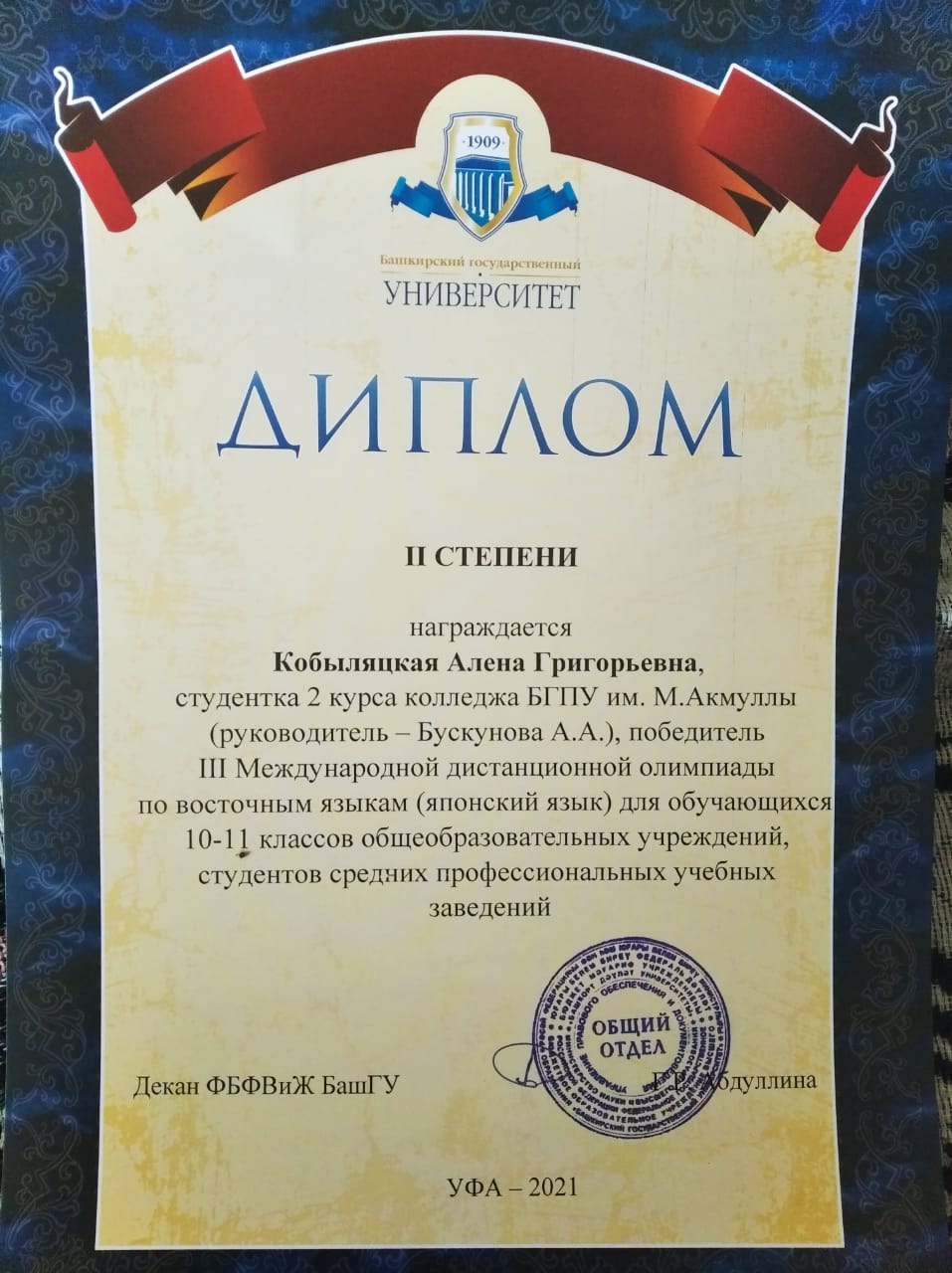 Поздравляем студентов Колледжа БГПУ им.М.Акмуллы, принявших участие в III Международной дистанционной олимпиаде по восточным языкам, которую провел Башкирский государственный университет для обучающихся 10-11 классов общеобразовательных учреждений, студентов средних профессиональных учебных заведений: Валиева Рузалина, группа 9ЗИО-21-19(22) – диплом II степени (корейский язык); Кобыляцкая Алена, группа 9ЗИО-21-19(22) – диплом II степени (японский язык), руководитель Бускунова А.А.; Искандарова Лина, группа 9ЗИО-11-20(23) - диплом II степени (корейский язык); Ганиева Юлия, группа 9ПСО-21-19(22) – сертификат участника. Желаем дальнейших успехов и побед!
