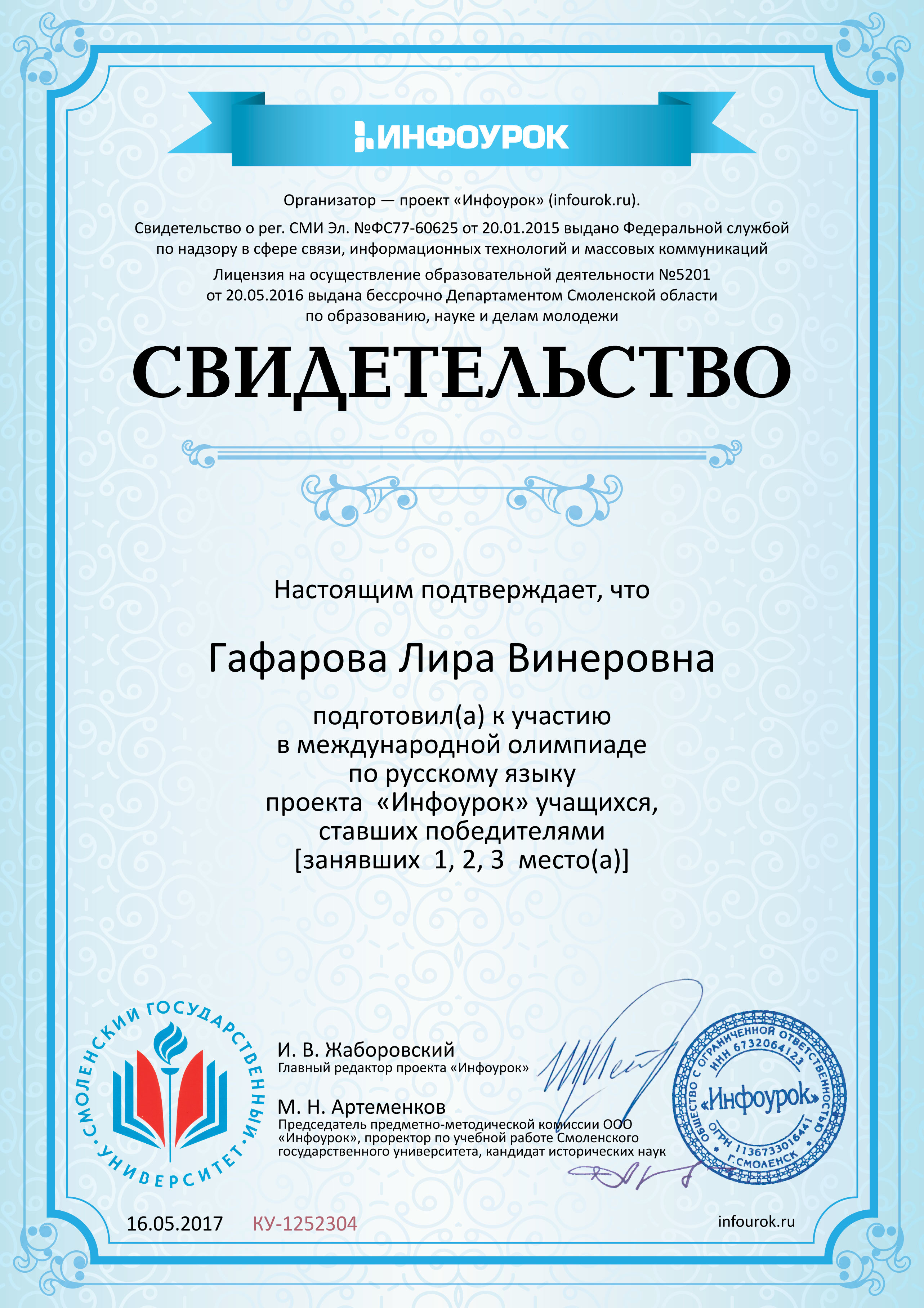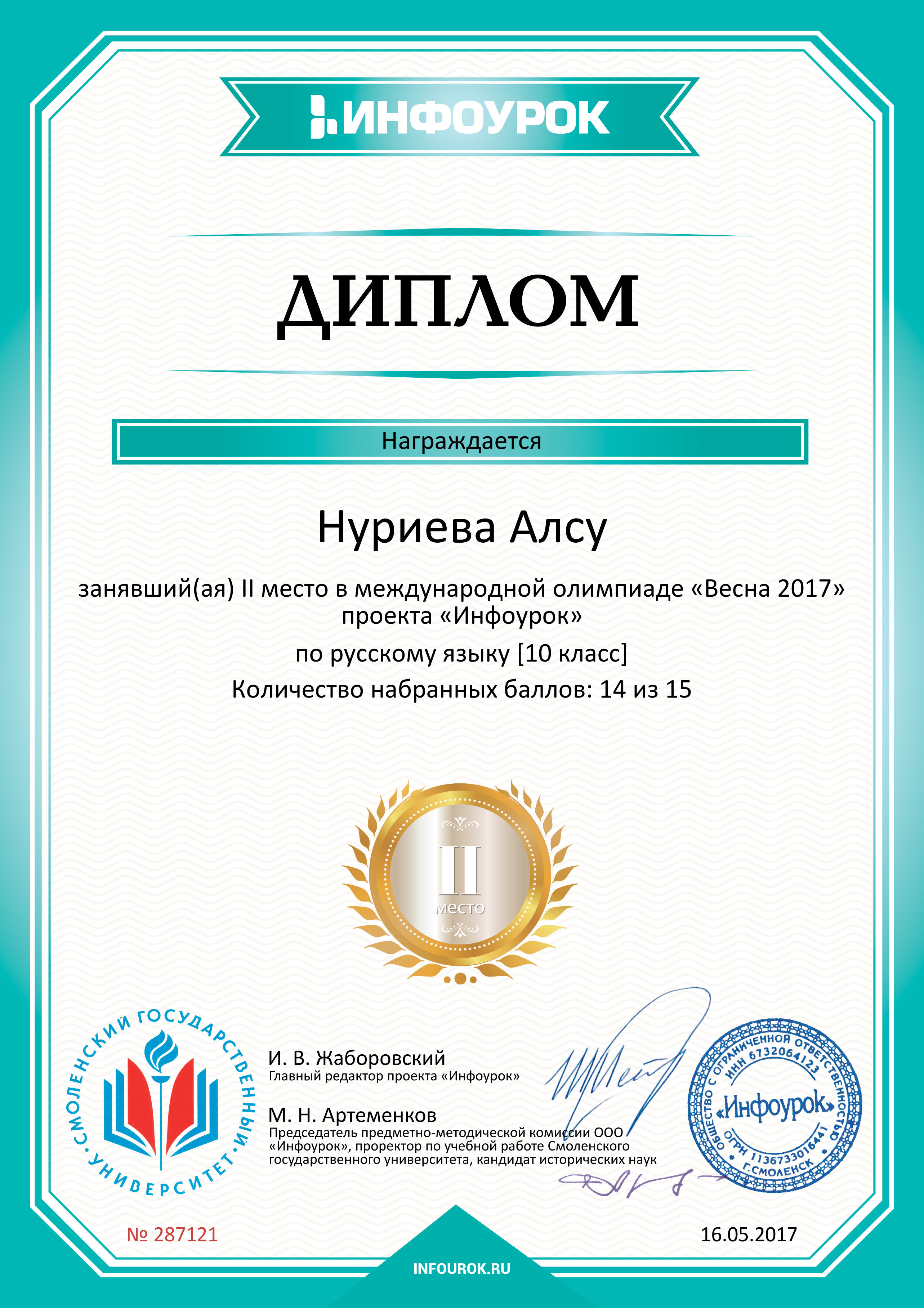 Международная Олимпиада по Русскому языку от проекта «Инфоурок»: диплом I степени – Донковцева А., Хайбрахманова Р., Хайруллина И. (гр. 9Э-11); диплом II степени – Токарева А., Нуриева А. (гр. 9Б-11); Воржева А., Алексеева Н., Адильмурзина Э., Габидуллина А., Заманова Г., Сулейманова Э., Харисова К.,Газизуллина А., Гаянова А., Зинатуллина А., Панкратова А., Сираева А. (гр. 9Э-11); Зилеева А., Панцеховская А. (гр.9Т-11); диплом III степени – Лотакова Н. (гр. 9Э-11); Нургалеева А., Султанмуратова Ф. (гр.9ПО-11); Юсупова Д., Юнусова Н., Щекатурова Е., Шамсутдинова Э., Чуклина А., Чиглинцев С., Фабарисова Н., Сахипова К., Нестерова А., Муратова Э., Конаева И., Катриш В., Карпова Л., Муравьева Е., Гаязова Э., Галлямова И., Галиханова Г., Булатова А.