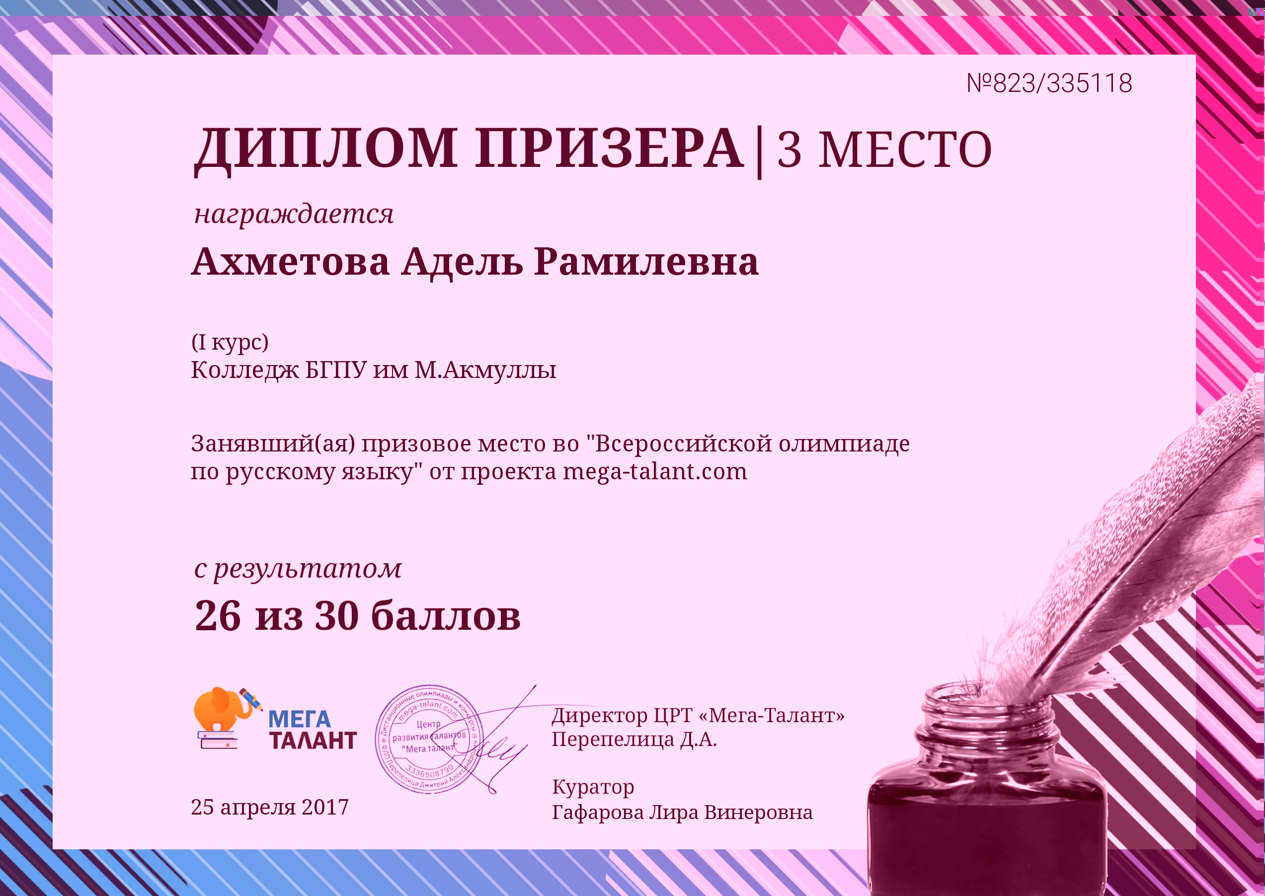 Всероссийская Олимпиада по Русскому языку для студентов от проекта mega-talant.com: диплом III степени – Ахметова А.(гр.9Т-11).