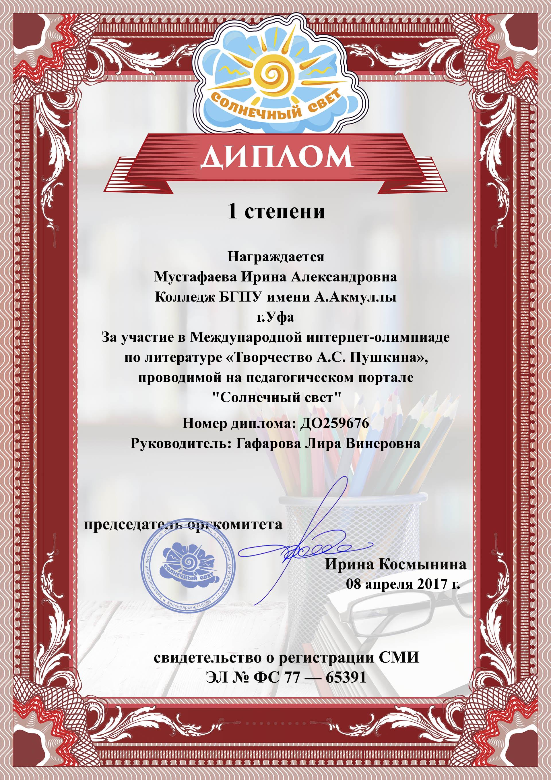 Международная интернет-олимпиада по Литературе на педагогическом портале «Солнечный свет»: диплом I степени – Мустафаева И.(гр. 9Б-11).