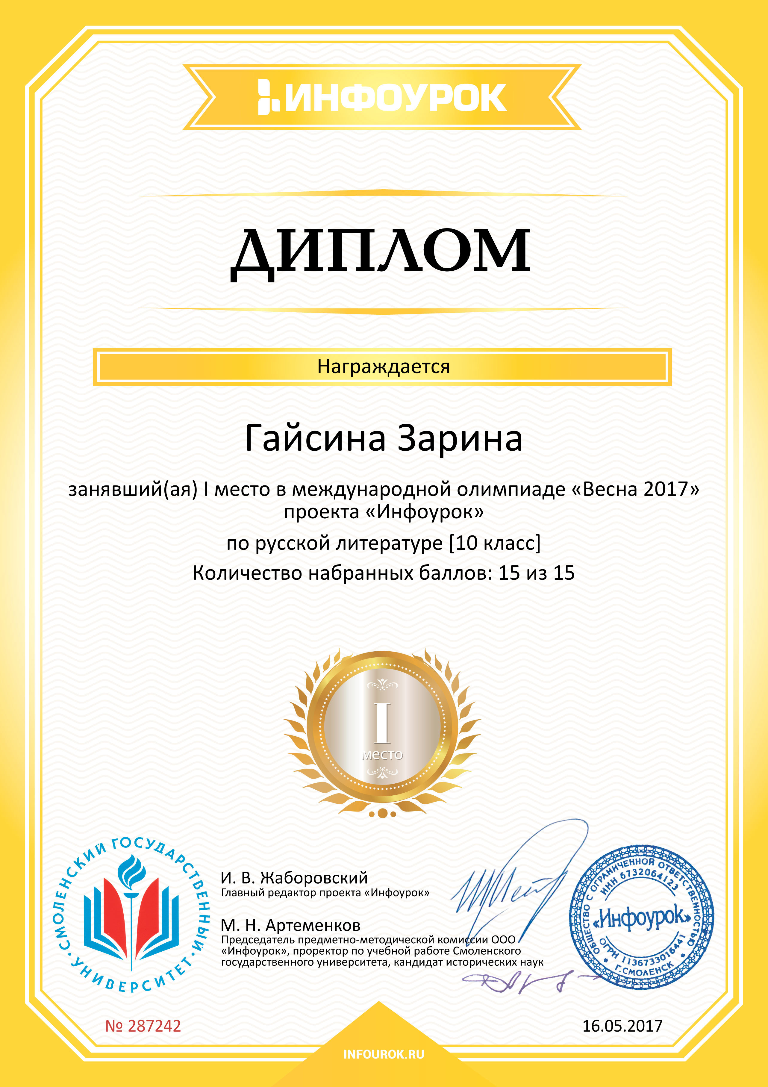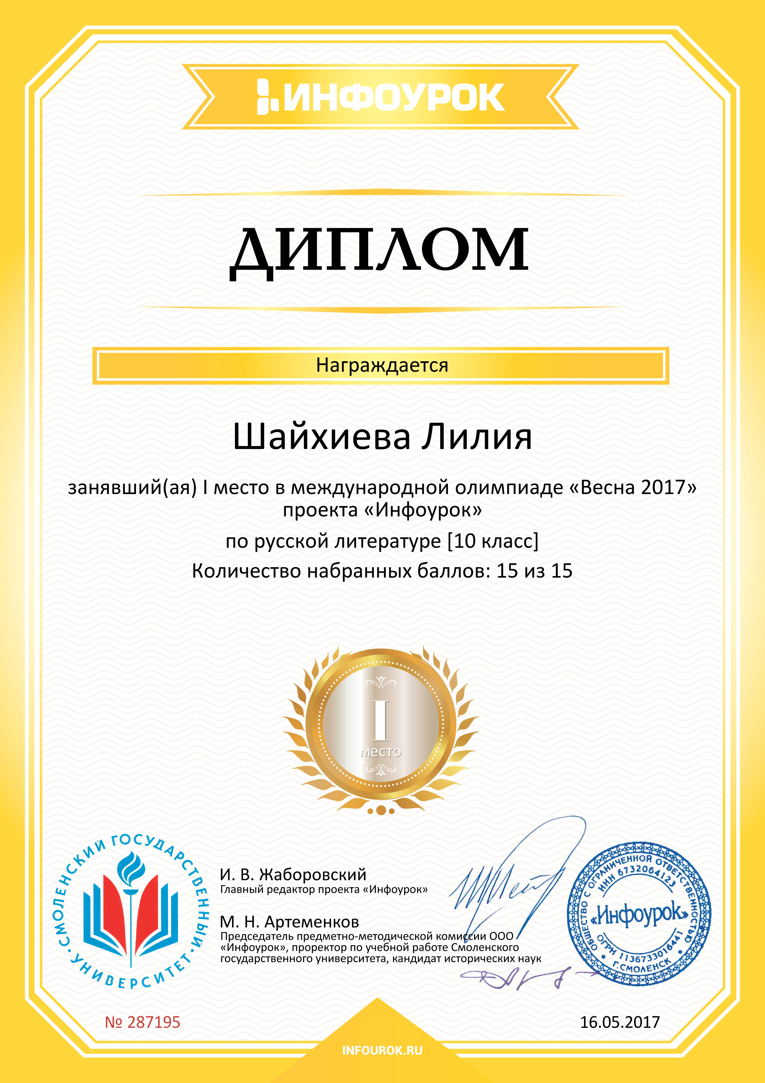 Международная Олимпиада по Русской литературе от проекта «Инфоурок»: диплом I степени – Зыкова Е. (гр.9Б-11); Гимадиева А., Шайхиева Л. (гр.9ПО-11); диплом II степени – Еникеева В., Мухамадеева Е. (гр.9Б-11); Щекатурова Е., Шарафутдинова А., Фабарисова Н., Абдулов И., Абдрахманова Я., Зилеева А., Конаева И., Нестерова А., Сахипова К. (гр.9Т-11); Музафаров Д. (гр.9ПО-11); диплом III степени – Хисамова Э. (гр.9Б-11); Красноборова Д., Пантюхина О., Усков А., Фатхлисламова И.(гр.9ПО-11); Ахметова А., Беседин Р., Исянбаева А., Катриш В., Муратова Э., Сулейманова А. (гр.9Т-11).