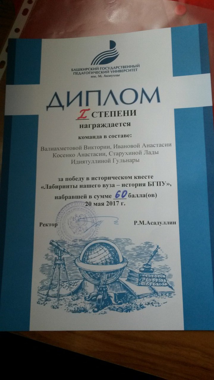 20 мая 2017 года студенты групп 9ЗИО-11 и 9ПСО-11 Колледжа БГПУ им. М.Акмуллы Валиахметова В., Иванова А., Косенко А., Старухина Л., Идиятуллина Г. под руководством преподавателя Асмондьярова Т.Н. приняли участие в историческом квесте «Лабиринты нашего вуза – история БГПУ». Данное мероприятие было посвящено 50-летию БГПУ им. М.Акмуллы. Студентки окунулись в мир истории, проходя через лабиринты времени. Например, побывали в 1967 году и разработали сценарий для рекламного ролика БГПУ; разгадывали древние иероглифы; отыскивали ключи, чтобы разгадать тайны. С увлечением и азартом наши студенты проходили все этапы квеста, применяя гибкость ума и ловкость рук. И вот он – финал! Студенты Колледжа БГПУ им. М.Акмуллы справились со всеми заданиями и стали обладателями диплома I степени. Поздравляем и желаем дальнейших побед!