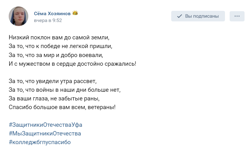 С 19 февраля любой желающий может написать ветеранам Великой Отечественной войны письмо со словами благодарности или же поздравлениями с 23 февраля. Колледж БГПУ им.М.Акмуллы не остался в стороне и  тоже присоединился к акции  #ПисьмоПобеды