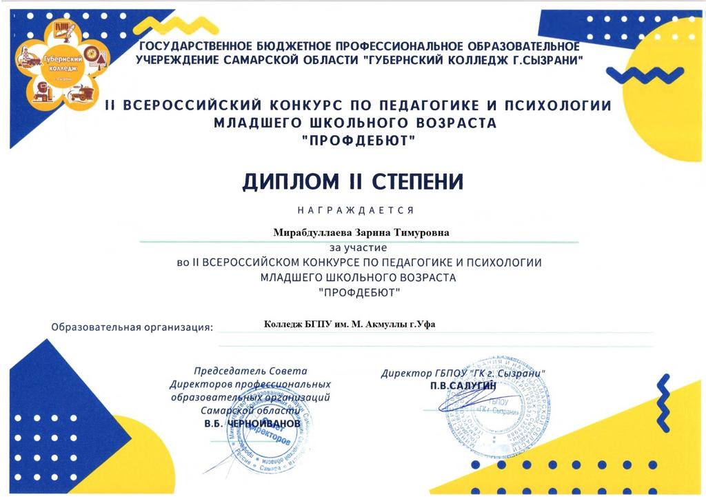 С 07 по 28 февраля 2022 года проводился II Всероссийский конкурс по педагогике и психологии младшего школьного возраста «ПРОФдебют». Данное мероприятие было организовано и проведёно с целью повышения интереса обучающихся профессиональных образовательных организаций к педагогике и психологии как теоретическим и прикладным наукам.