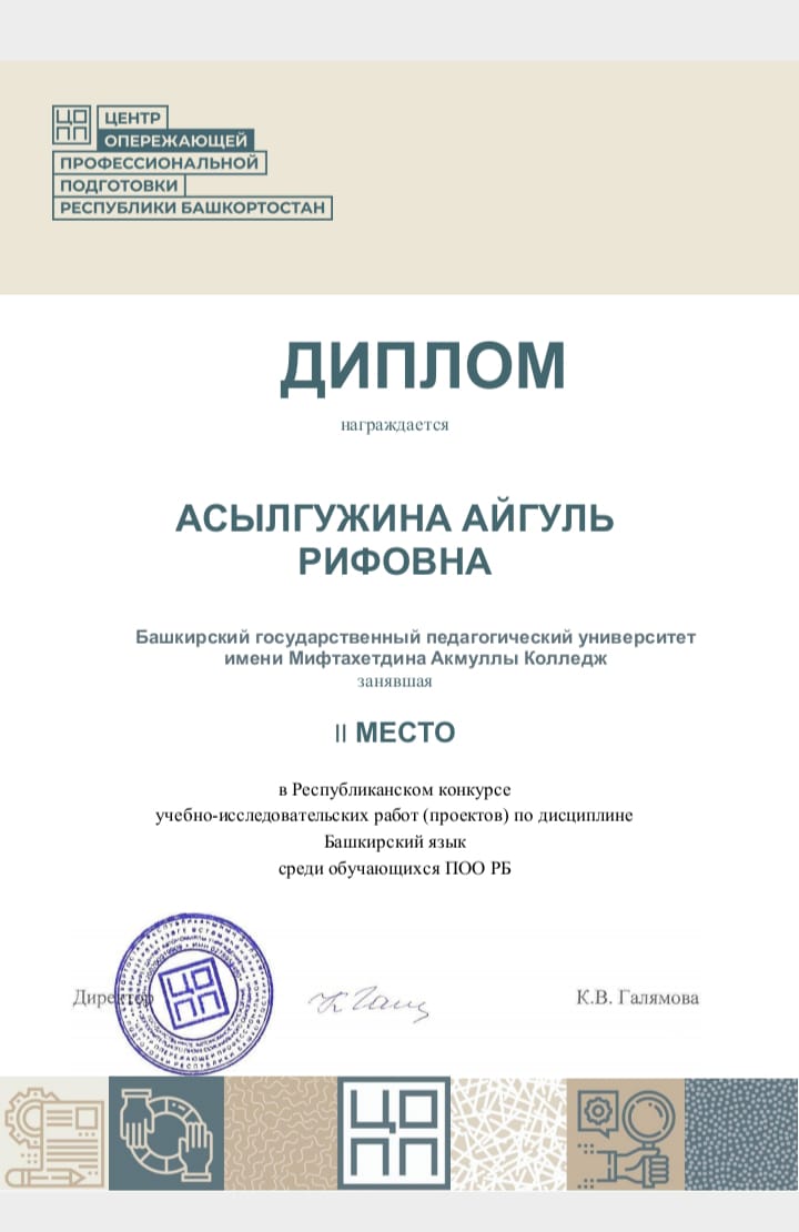 Студентка колледжа Асылгужина Айгуль приняла участие в Республиканском конкурсе проектов, посвященных жизни и творчеству М.Акмулле. Айгуль в своей исследовательской работе отразила жизненный и творческий путь великого башкирского просветителя, в практической части провела конкурс сочинений "Письмо Акмулле".