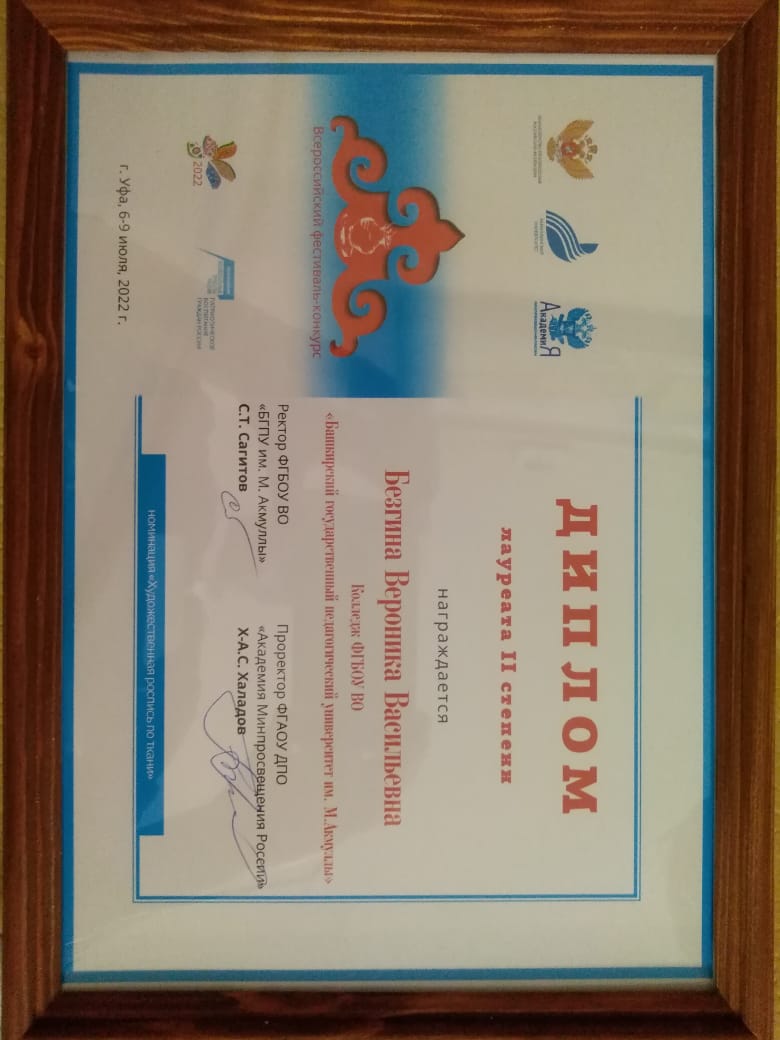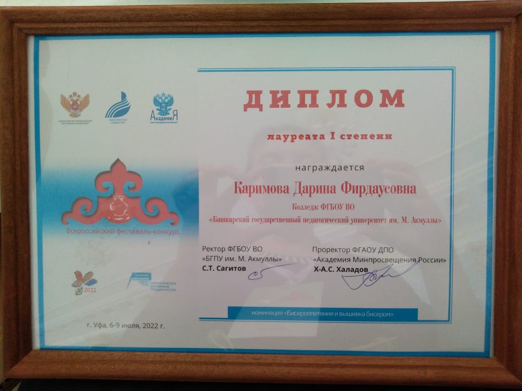 В нем приняли участие студенты нашего  Колледжа специальностей   «Изобразительное искусство и черчение» и «Преподавание в начальных классах». То, что ребята прошли заочный отборочный этап и попали в финал – уже большое достижение. Но и вовремя финальных, очного этапа, в котором было два конкурсных испытания – защита своего проекта и выполнение задания, полученные от экспертов фестиваля-конкурса, студенты колледжа не подкачали. У нас замечательные результаты:- все участники, а это: Агаджанива Лейсан, группа 9ИЗО-31-19(23), Валитова Гульназ, группа 9ИЗО-41-18(22), руководитель Агишева Лиза Рафиковна, Бутко Валерия, группа 9ИЗО-21-20(24), руководитель Садыкова Регина Римовна, получили сертификаты участников финала, а Казакбаева Наина группа 9ИЗО-21-20(24), руководитель Козлова Галина Владимировна – Диплом Лауреата 1 степени, в номинации «Художественная обработка дерева» Каримова Дарина, группа 9ПНК-11-21(25),руководитель Валеева Эльвира Ангамовна – Диплом Лауреата 1 степени в номинации бисероплетение и вышивка бисером», Безгина Вероника, группа 9ИЗО-19(23), круководитель Козлова Галина Владимировна – Диплом Лауреата 2 степени в номинации «Художественная роспись по ткани».