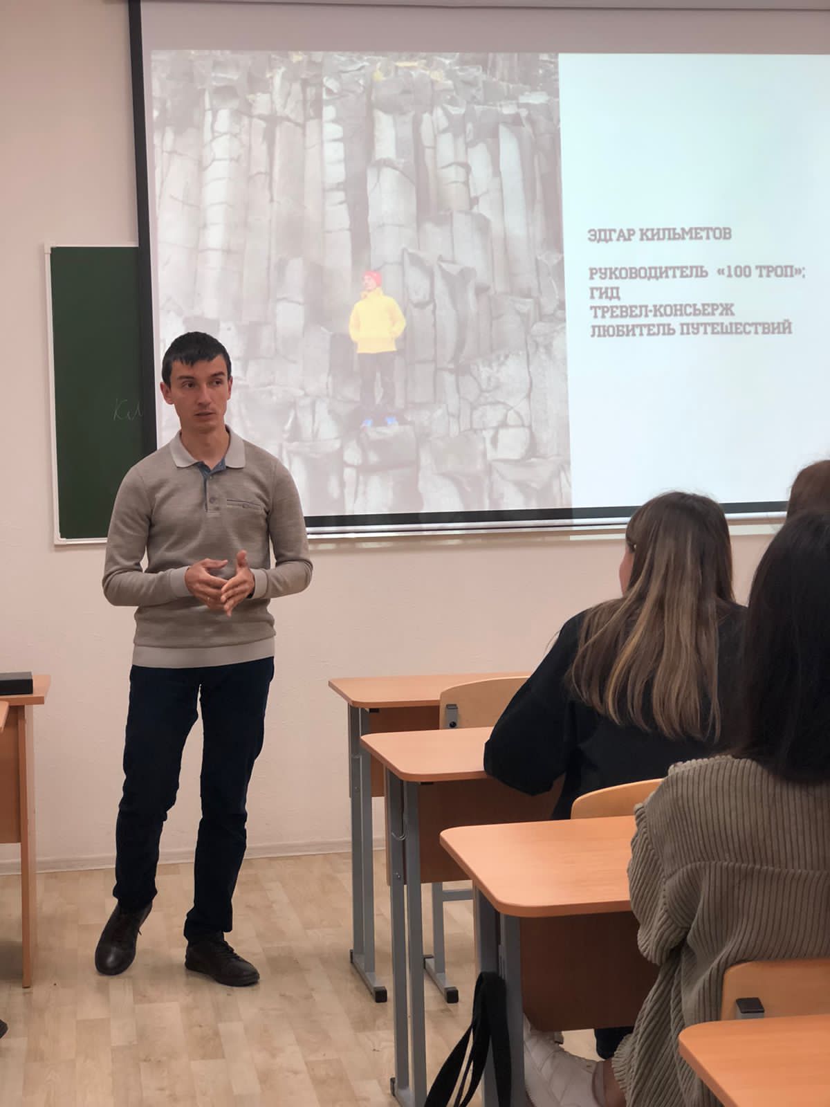 Приглашённый спикер Эдгар Кильметов, гид и работодатель компании  "100Троп»,  любитель путешествий, рассказал о плюсах и минусах работы, о рисках туристического дела,  дал советы и рекомендации к будущей работе.  Так же коротко ознакомил со своей компанией. Ежегодно они организовывают десятки путешествий, в таких уникальных природных районах как Камчатка, Байкал, Кавказ, Алтай, Исландия, Фарерские острова и десятки путешествий выходного дня по Республике Башкортостан и Южному Уралу. Приятные воспоминания, взрывные эмоции и возможность увидеть мир.