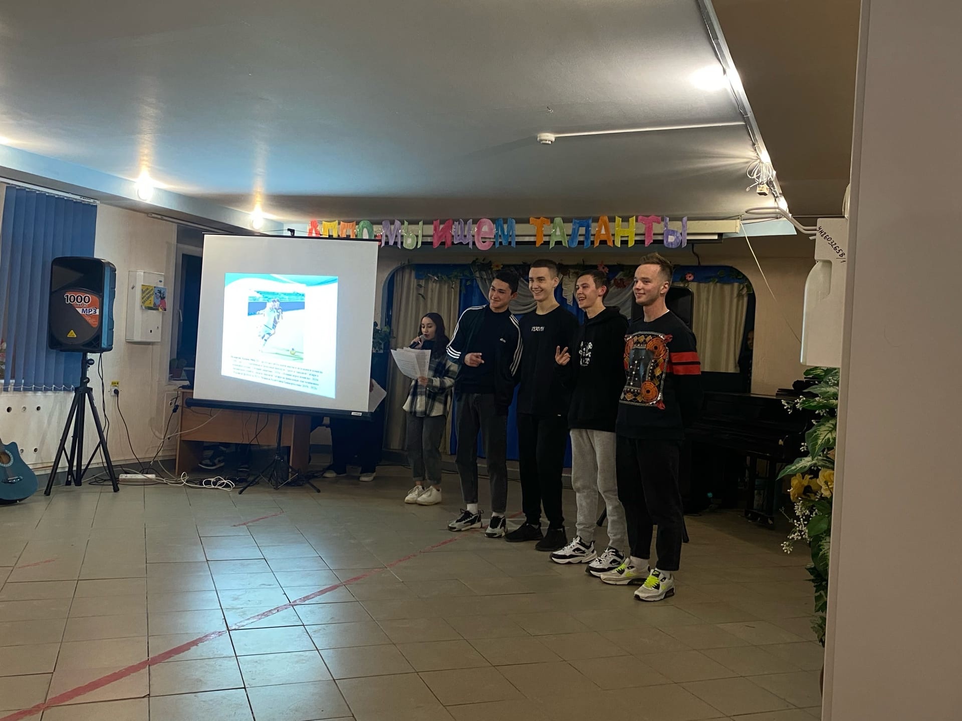 Сценарий мероприятия был построен с использованием проектора, чтобы студенты демонстрировали свои грамоты, дипломы, видеосюжеты.
