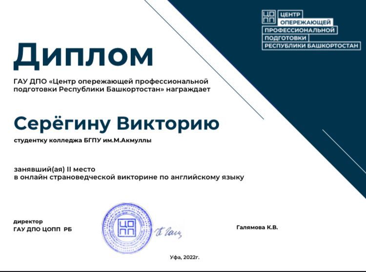 22 декабря 2022 года прошла республиканская страноведческая онлайн викторина по английскому языку. Она была проведена с целью выявления и поддержки одареных обучающихся, углублению знаний по английскому языку и страноведению. К участию были приглашены студенты 2 курсов колледжей Республики Башкортостан, по 2 человека от образовательной организации. Наш колледж представляли студенты специальностей Туризм и Гостиничное дело. В викторине приняли участие более 100 студентов колледжей РБ. Тем приятнее стала победа Серегиной Виктории (руководитель Хабибуллина С.И.), студентки группы 9 ГД21. Она заняла почетное 2 место. Вика поделилась своими впечатлениями и рассказала нам, что сложными оказались вопросы на знание произведений американских писателей и истории США.