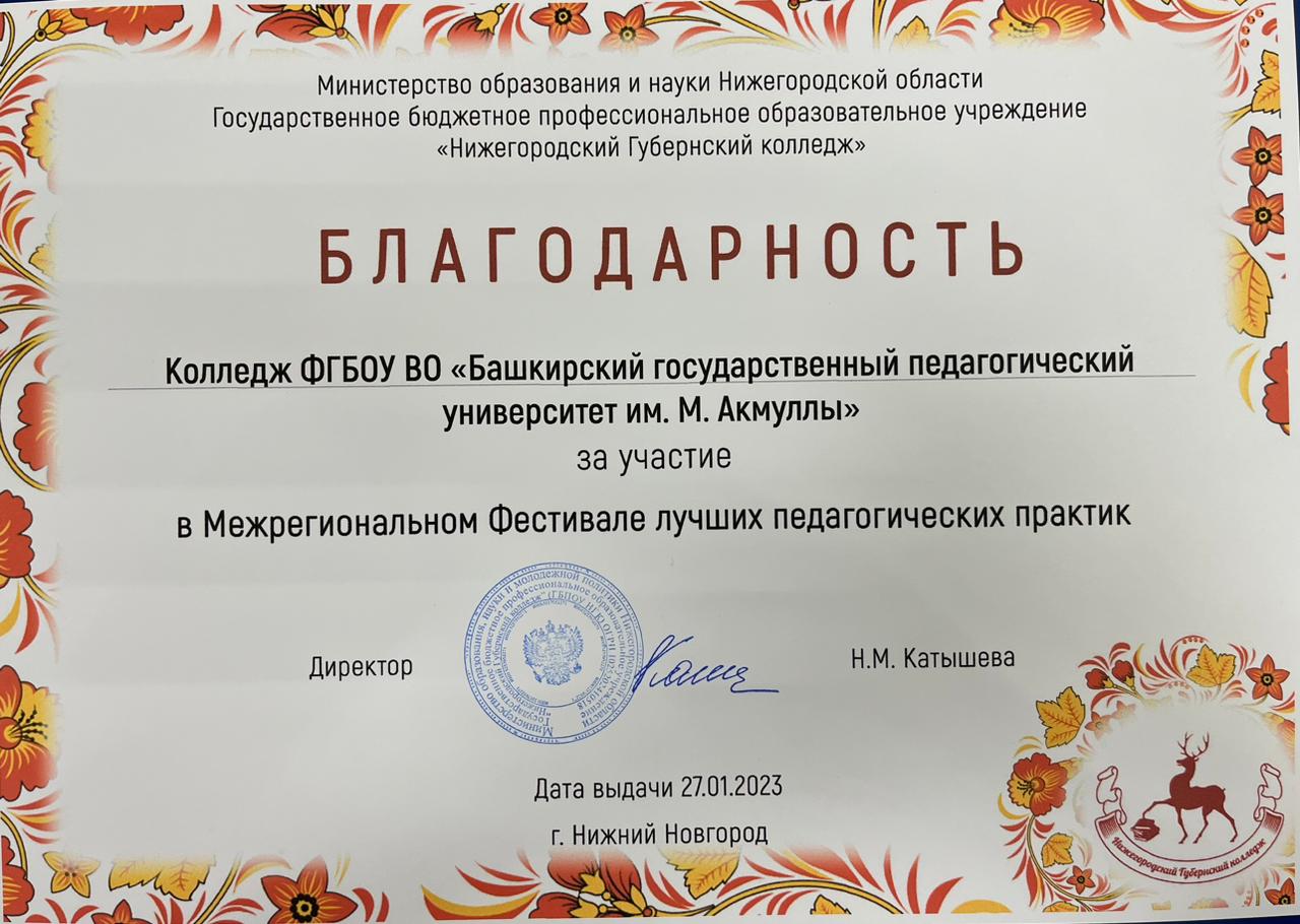 Преподаватель Галлямова Яна Ирековна, выступила с докладом: Интеграционные процессы подготовки педагогов дошкольного образования в системе «колледж-ВУЗ» на Межрегиональном Фестивале лучших педагогических практик г. Нижний Новгород с 26-27 января 2023.