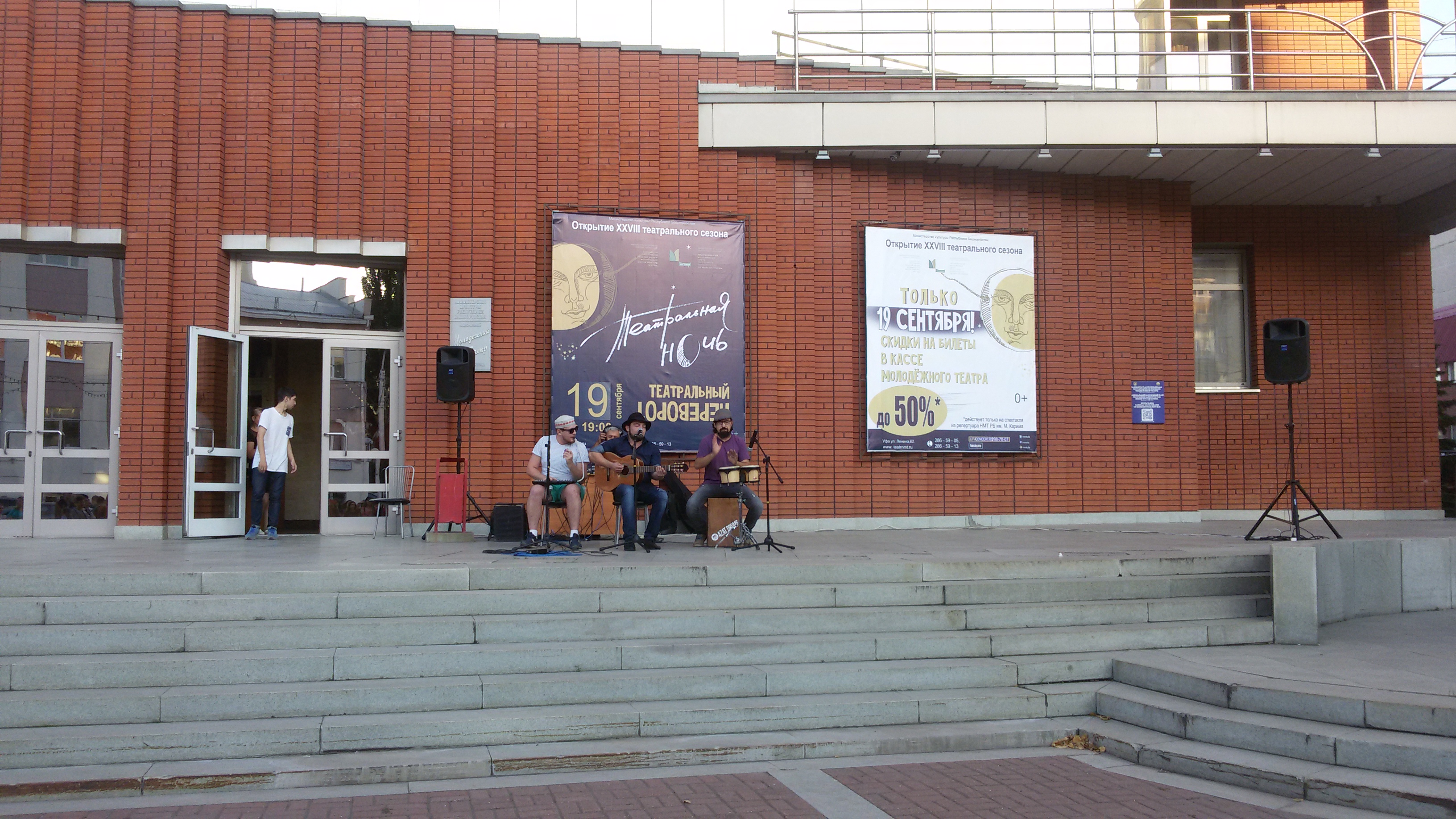 Сначала студенты посмотрели концерт с участием уфимских групп на площади перед Национальным молодежным театром им. М. Карима. Затем часть ребят в Большом зале театра посмотрели спектакль «Датская история». Остальные же отправилась на Гостиный двор. Здесь в «Ночь театров» сразу три театра дали полноценные представления. «the Театр» выступил со своим традиционным представлением «Читка пьесы».