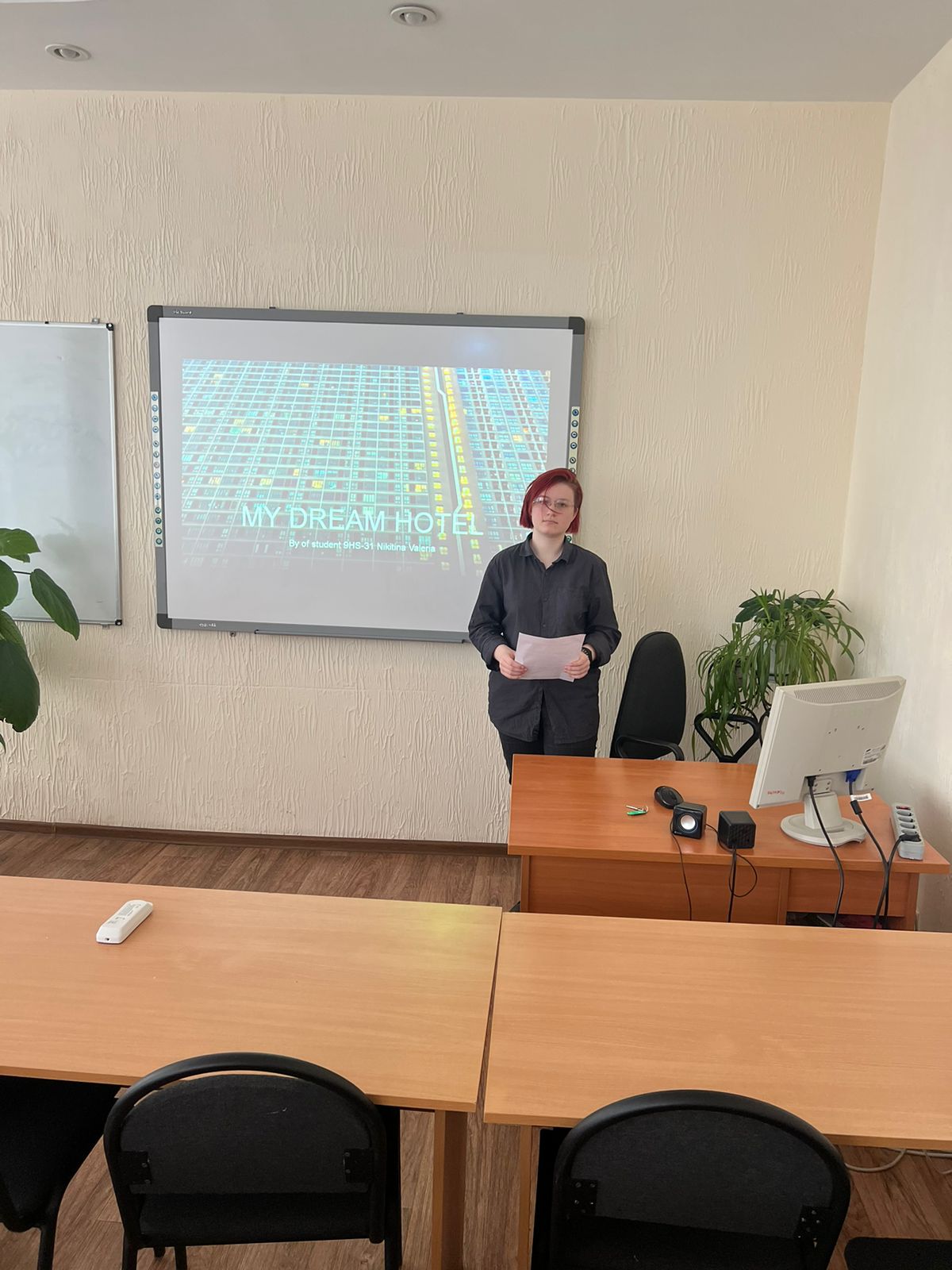 6 марта 2023 года в выпускной группе 9ГС-31-20(23) прошла традиционная защита студенческих проектов на английском языке «My Dream Hotel»(Отель моей мечты). Оценка работ была не только со стороны преподавателя Хабибуллиной  С.И., но и со стороны самих студентов. Студенческому творчеству не было предела: были представлены отели различных видов и звездности: Hobbit Hotel, Pearl Hotel, Magia de la Vida,  Cortez, Barbie House и другие. Наибольшее впечатление произвели отель Ивановой Вероники Feel Like a Star, в котором гости могли почувствовать себя настоящими звездами известных кинофильмов. Необычным и очень интересным был отель на дереве Каюмовой Элиры Lonataya по мотивам фильма «Аватар». Замечательные презентации и доклады показали Нигмадьянова Диана, Смакова Софья, Хасанова Миляуша. Защита проектов завершилась подробным анализом представленных работ и пожеланиями по их совершенствованию.  Залог успеха-это отличное знание дисциплины, к такому выводу пришли все выступающие.