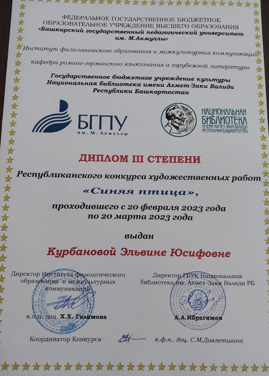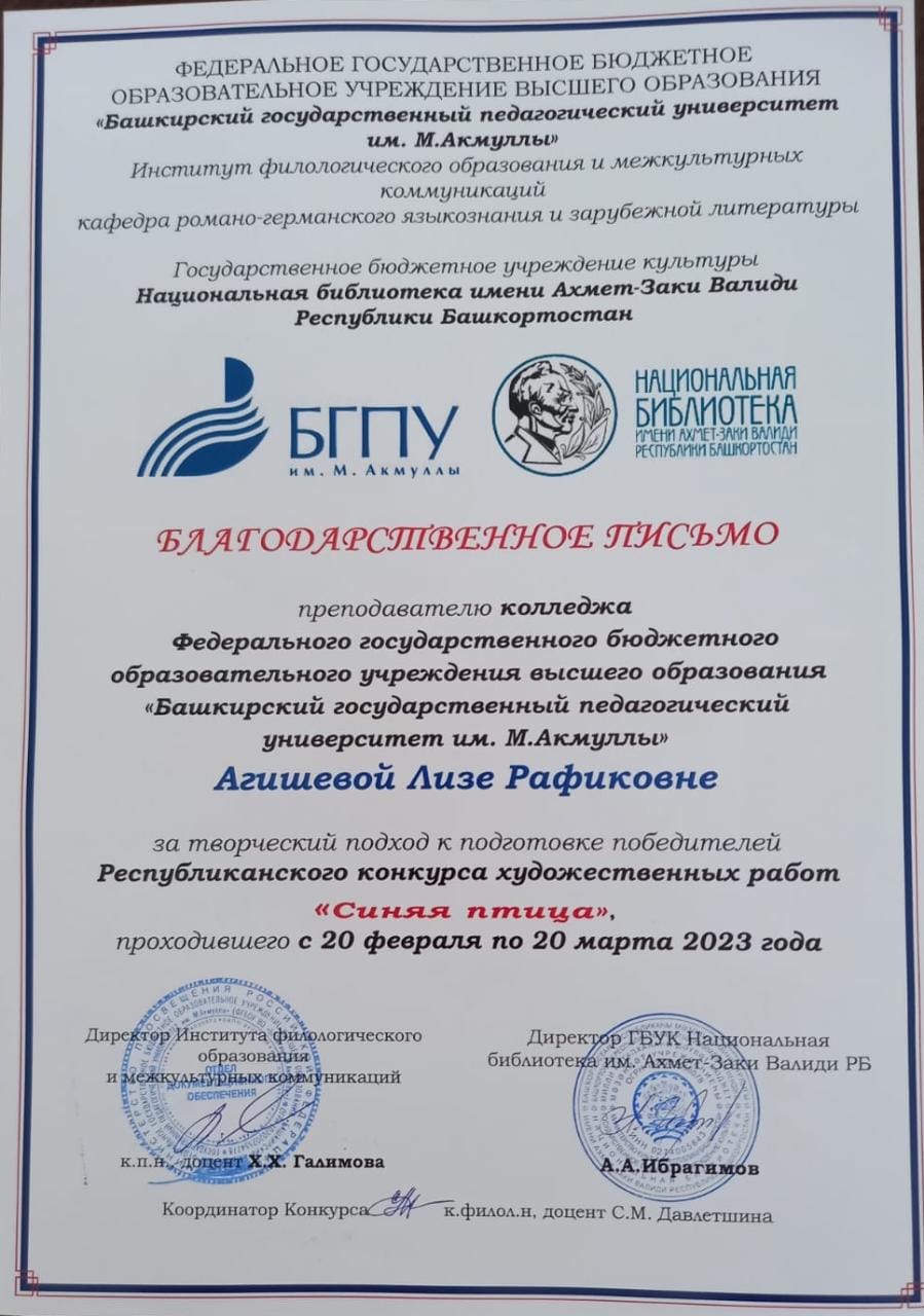 Студенты 1, 2, 3 курсов специальности «Изобразительное искусство и черчение» приняли активное участие в X Республиканском конкурсе художественных работ, посвященный 115-летию первой постановки пьесы бельгийского писателя Мориса Матерлинка «Синяя птица». Конкурс проходил с 20 февраля по 20 марта 2023 года на базе Института филологического образования и межкультурных коммуникаций БГПУ им. М.Акмуллы. Церемония награждения прошла 25 апреля в рамках Фестиваля «Франкофония 2023».