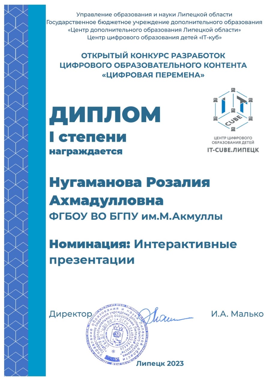 По результатам конкурса преподаватель Колледжа БГПУ им.М.Акмуллы Розалия Ахмадулловна Нугаманова  заняла первое место в  номинации  "Интерактивные презентации"