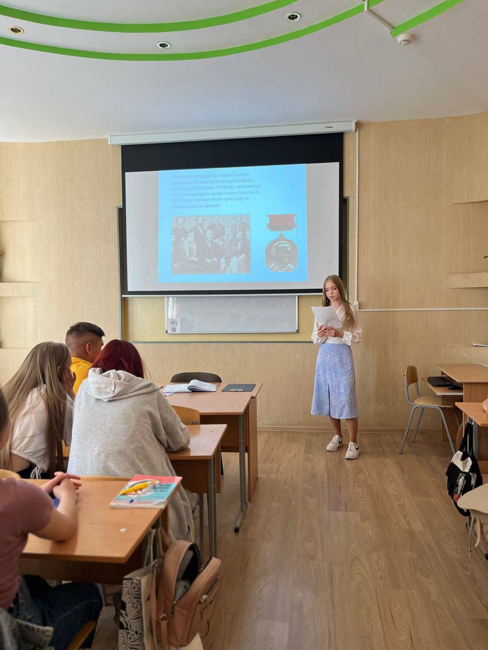 Несколько студентов группы выступили с подготовленными докладами на тему «Жизнь и педагогическая деятельность М. В. Ломоносова, Д. И. Менделеева и А. М. Бутлерова".