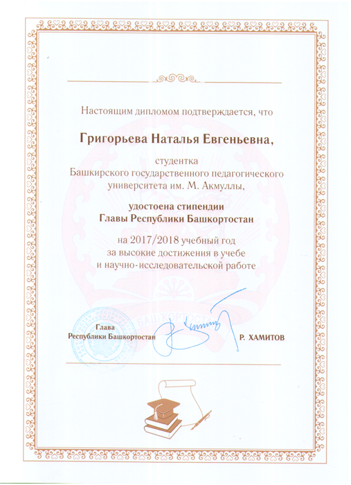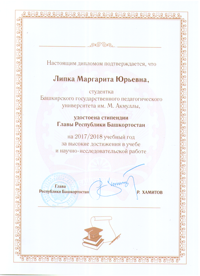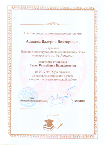 6 октября 2017 года в БГПУ им. М. Акмуллы состоялось вручение именных стипендий для особо одаренных обучающихся, добившихся лучших результатов в учебе, спорте и творческой деятельности в текущем году. На церемонии присутствовали: министр образования РБ Г. Р. Шафикова, ректор ФГБОУ ВО БГПУ им. М. Акмуллы Р. М. Асадуллин, директор Института исторического и правового образования А. И. Кортунов. Студенты Колледжа БГПУ им. М. Акмуллы В. В. Асмаева, Н. Е. Григорьева, М. Ю. Липка были удостоены стипендии Главы Республики Башкортостан за высокие достижения в учебе и научно-исследовательской работе.
