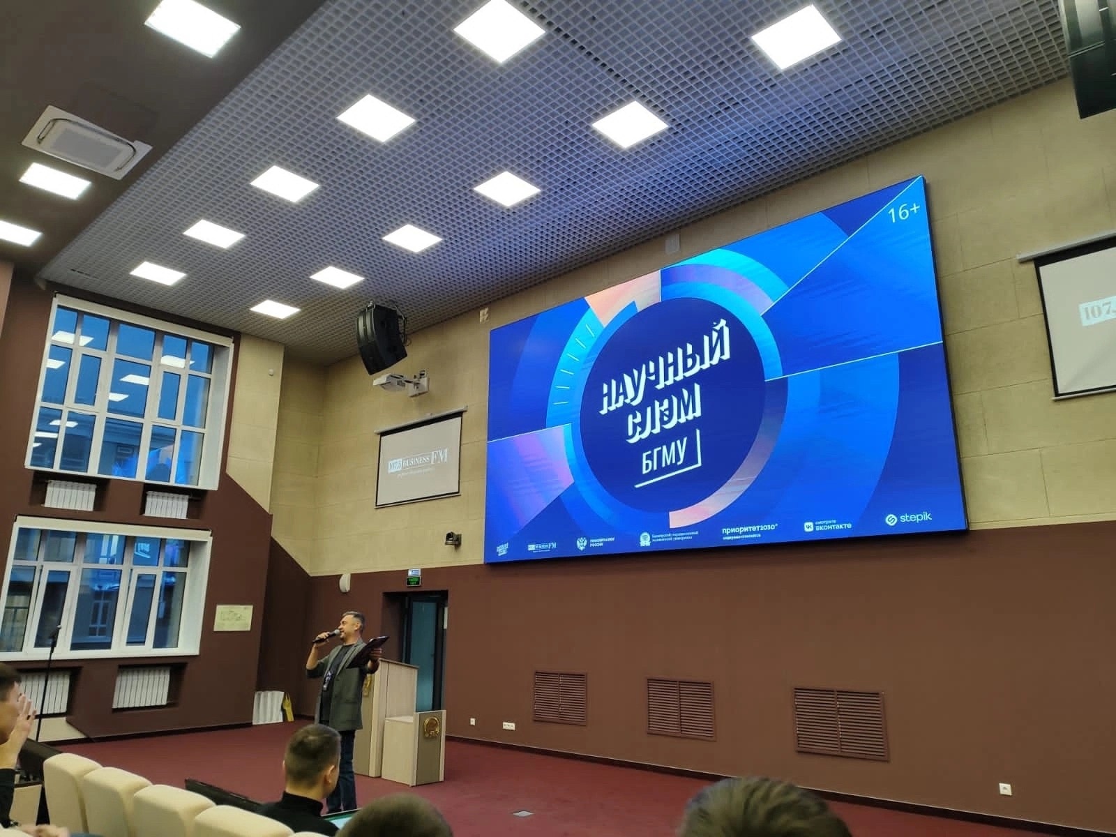Шесть учёных выступили с темами своих исследований в формате стэндапа. Победителя выбирает зал, помощью шумомера. У кого аплодисменты громче, тот и победил.