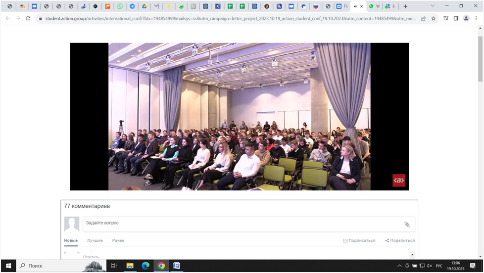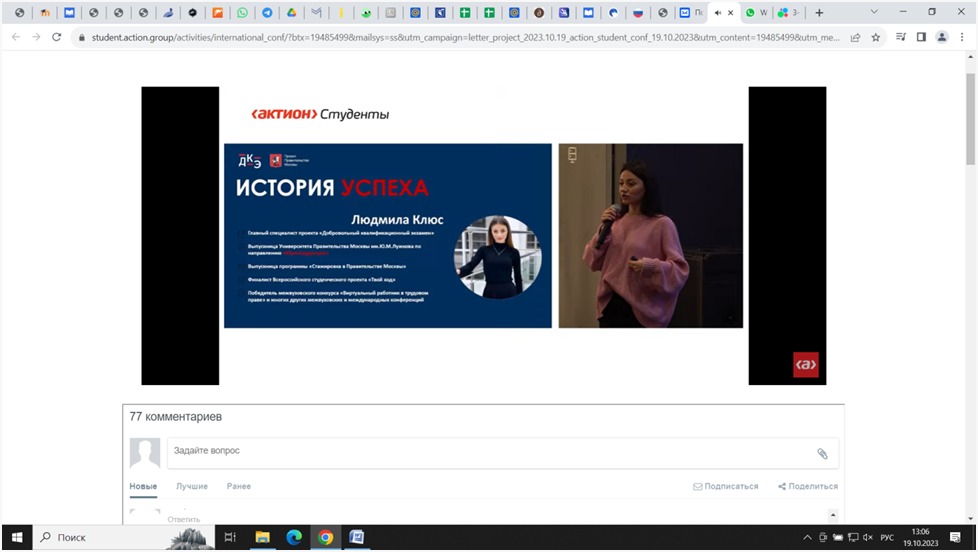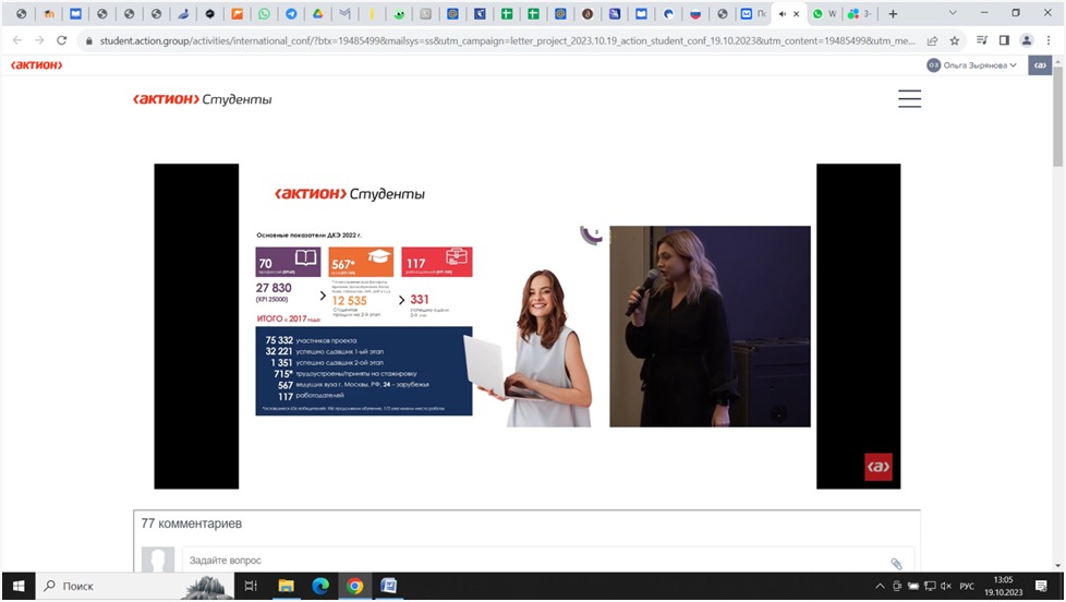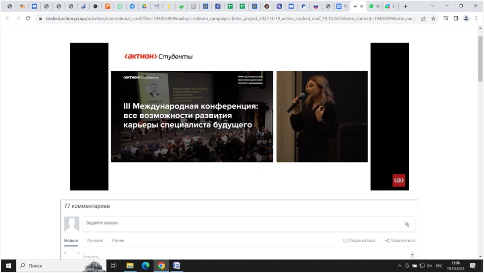 19 октября 2023 года студенты специальности 43.02.14  Гостиничное дело (группы 9ГД-21-22(26), 9ГД-22-22(26), 9ГД-31-21(25)) под руководством преподавателя экономических дисциплин Зыряновой О.В. приняли онлайн участие в III Международной конференции Актион Студенты: все возможности развития карьеры специалиста будущего.