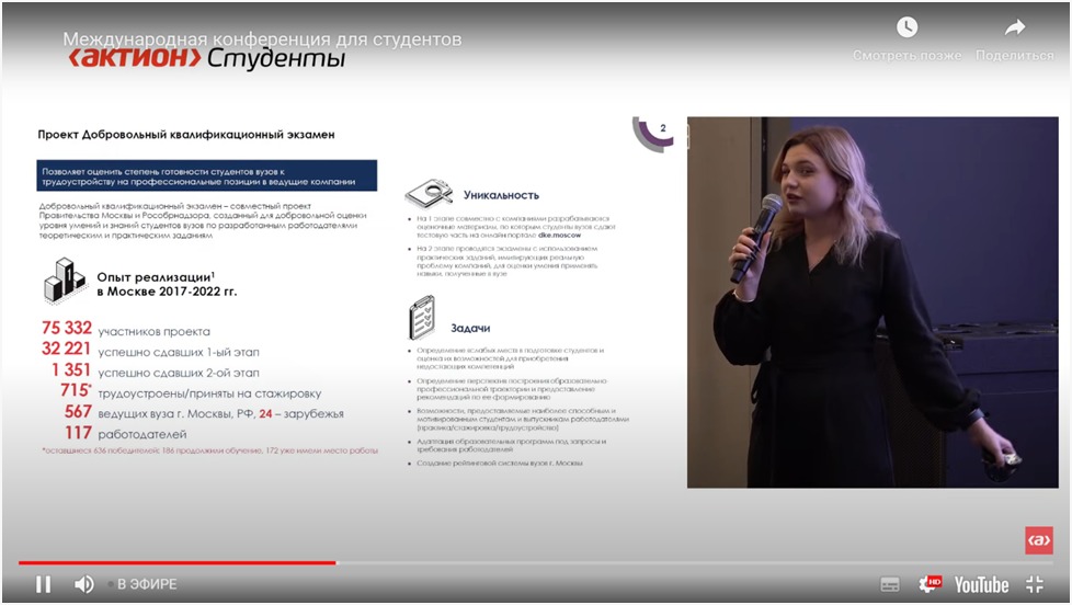 Конференция Актион Студенты — это пространство развития навыков и  трансформации знаний  амбициозных студентов. Все возможности развития молодого специалиста были представлены на одной конференции. Спикеры из четырех стран с высокой эспертизой: Умнова Анастасия-руководитель проекта Добровольный квалификационный экзамен, Анна Петрова, руководитель программы стажировок Анкор, Ирина Куценко-директор по маркетингу Актион студенты, Ольга Кузнецова-заместитель началника отдела сопровождения молодежных проектов Росмолодежь, Елена Родионова-бизнес тренер и спикеры из других стран. Все участники имели возможность задавать вопросы онлайн, выбирать свой вектор для построения карьеры и бизнес мечты.
