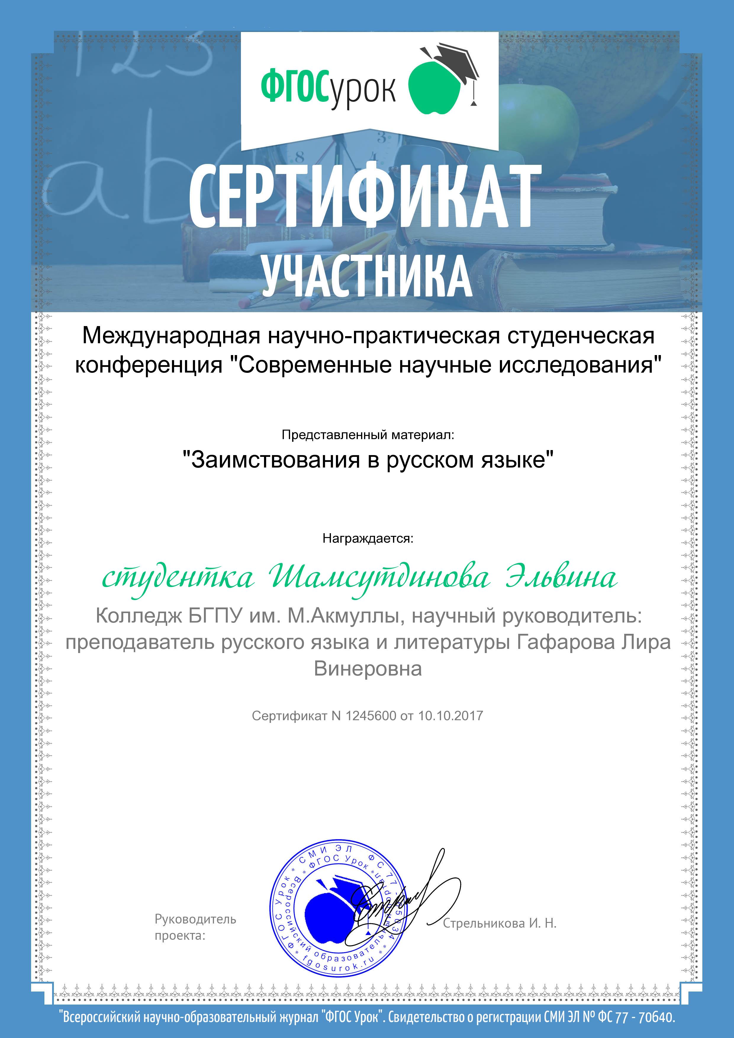 Студентка 2 курса специальности «Туризм» Колледжа БГПУ им. М.Акмуллы  Эльвина Шамсутдинова (руководитель Л.В.Гафарова) приняла участие в Международной научно-практической студенческой конференции «Современные научные исследования». Ее проект «Заимствования в русском языке» опубликован в электронном сборнике.
