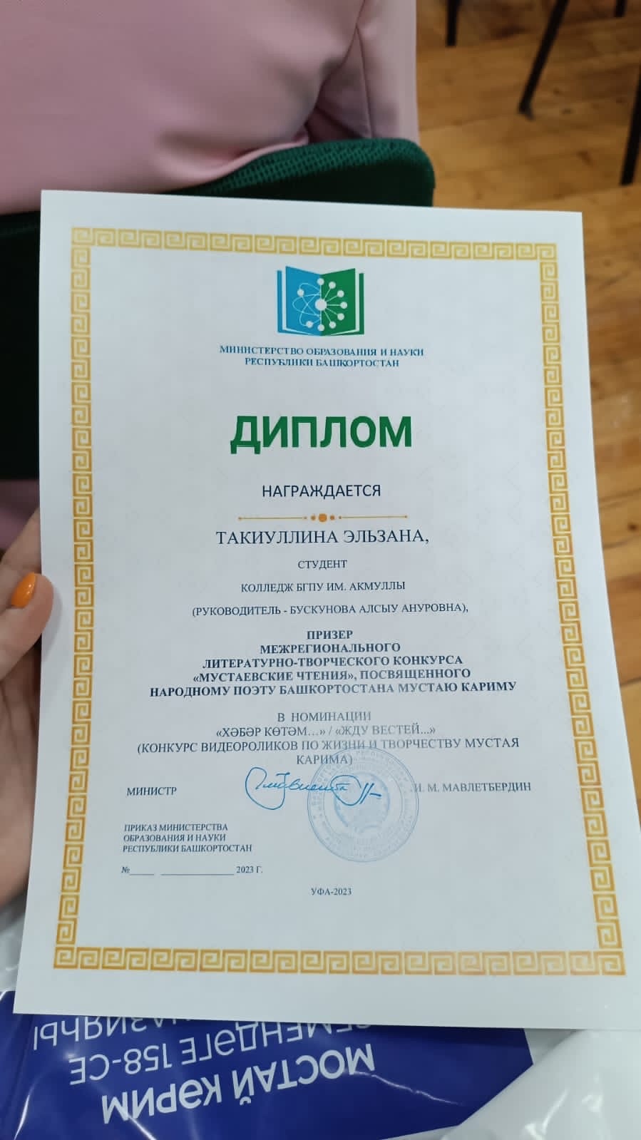 Студентка нашего колледжа группы 9Т-21-22(25) специальности «Туризм»Такиуллина Эльзана стала призером в номинации «Конкурс видеороликов «Жду вестей...» («Хәбәр көтәм…») о жизни и творчестве Народного поэта Мустая Карима и была удостоена Диплома призера в Межрегиональном конкурсе( научный руководитель А.А. Бускунова).
