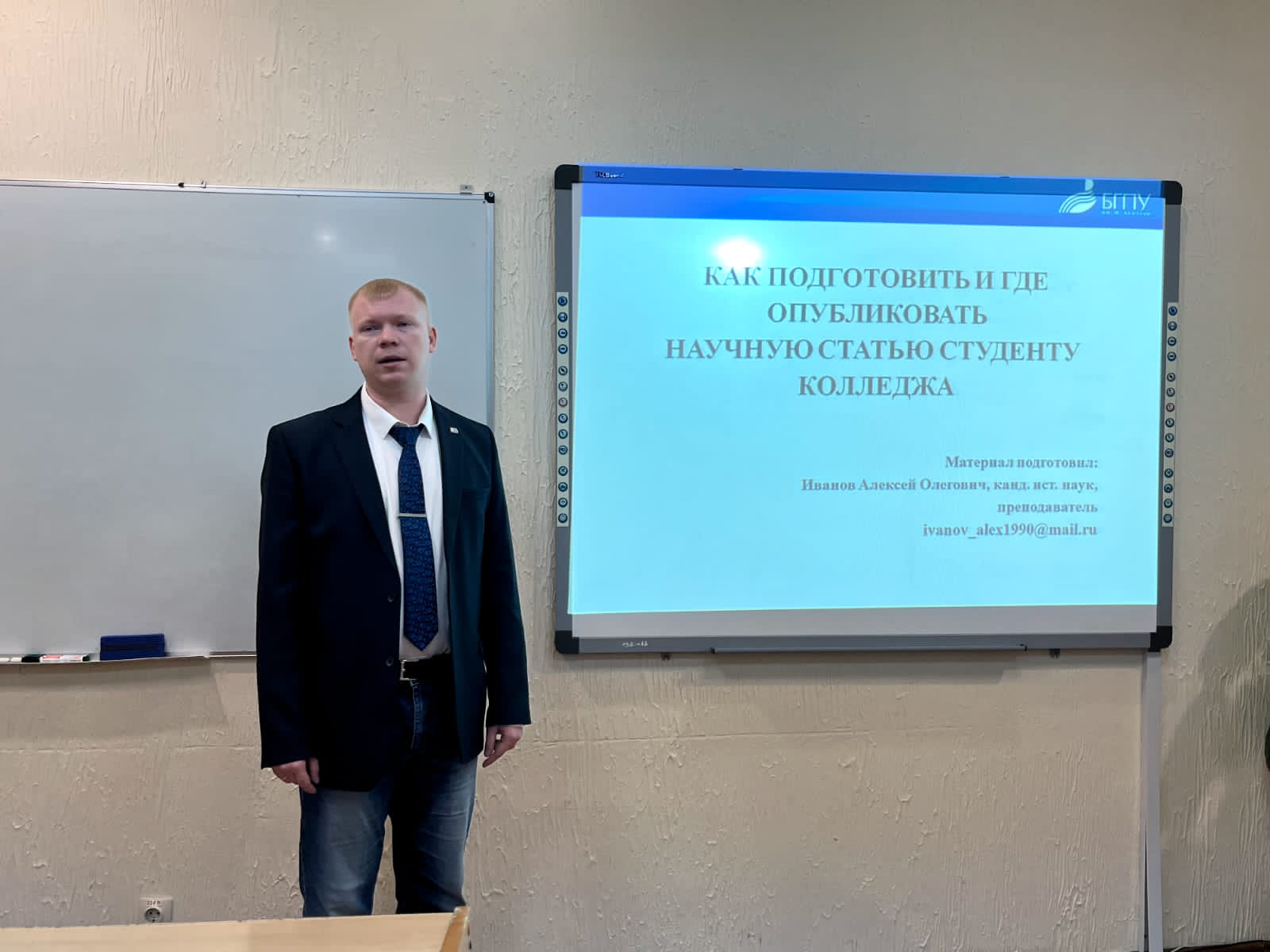 Как написать научную статью? Об этом, в ходе лекции, поделился опытом и дал свои рекомендации кандидат исторических наук, преподаватель колледжа Алексей Олегович Иванов. Студенты узнали также, как выбрать тему и научного руководителя, источники и технологию выбора конференций для участия в них.