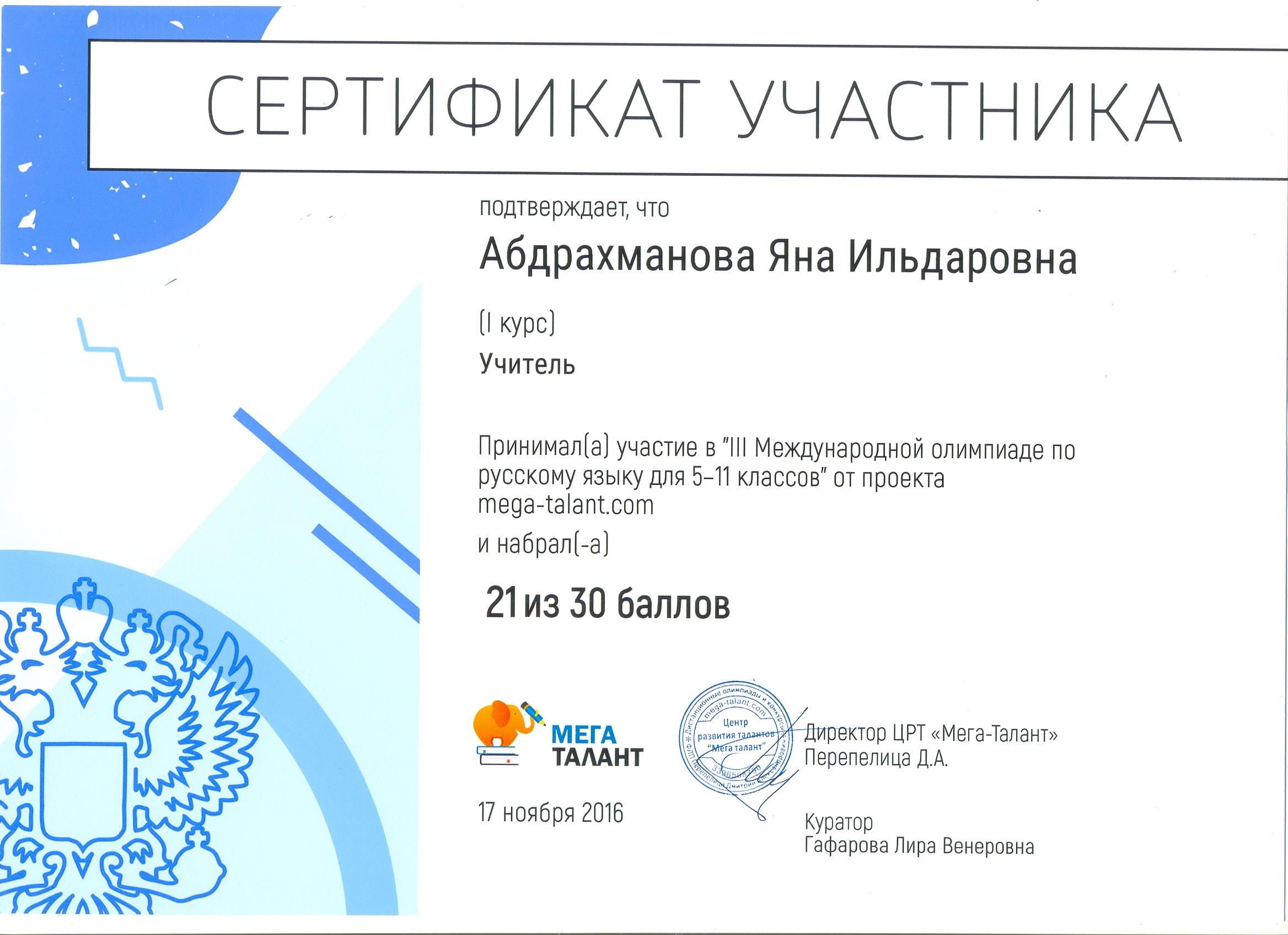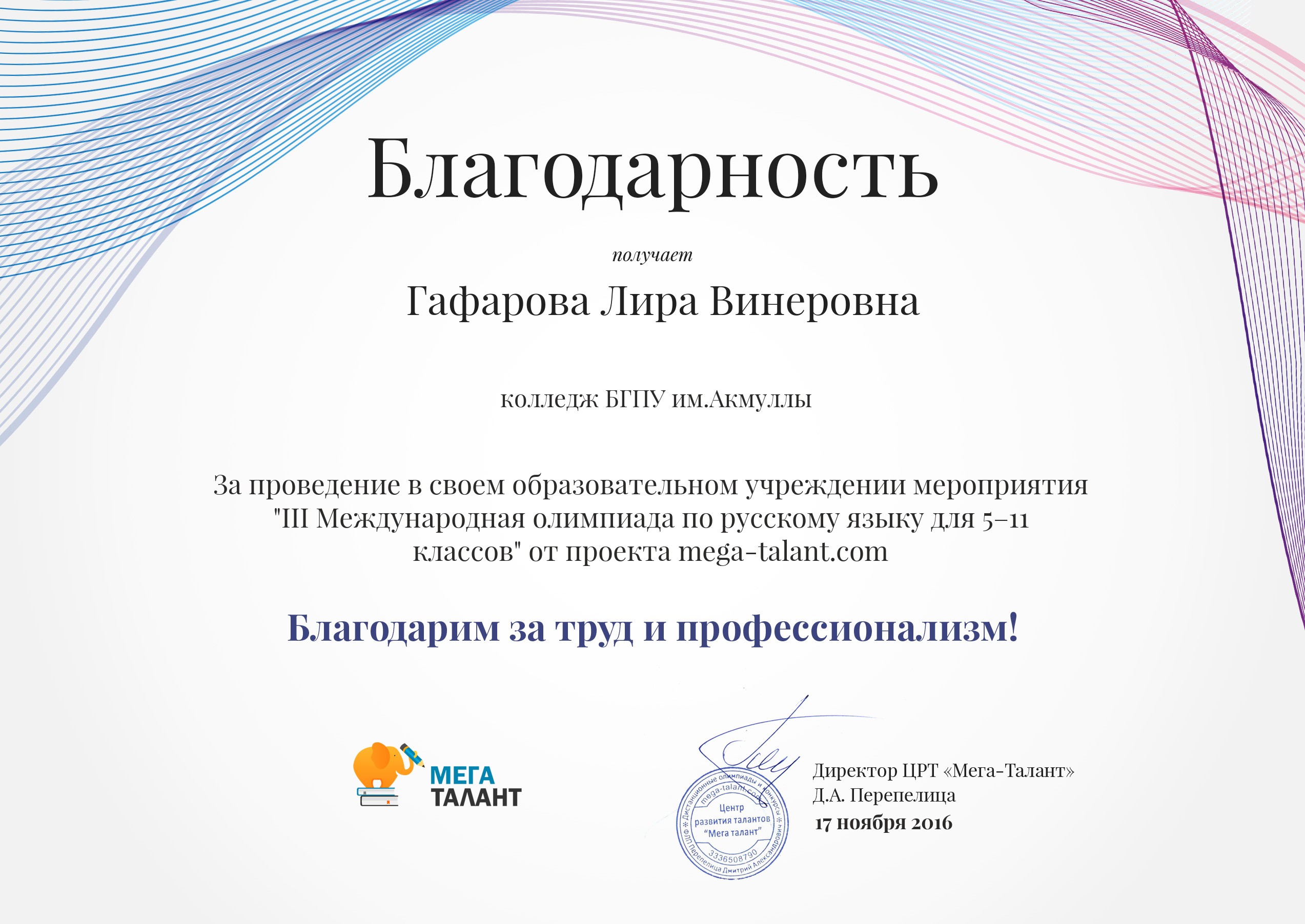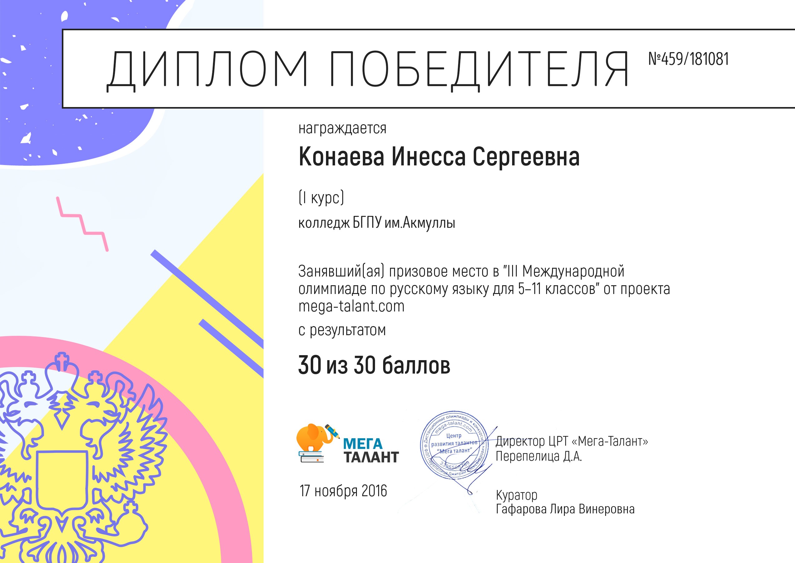 Международная олимпиада по русскому языку от проекта mega-talant.com: 1 место Нестерова А. – гр.9Т-11. 1 место Конаева И. – гр. 9Т-11. 2 место Галиханова Г. – гр. 9Т-11. 3место Фабарисова Н. – гр. 9Т-11. Сертификаты Абрахманова А., Юнусова Г. – гр. 9Т-11.