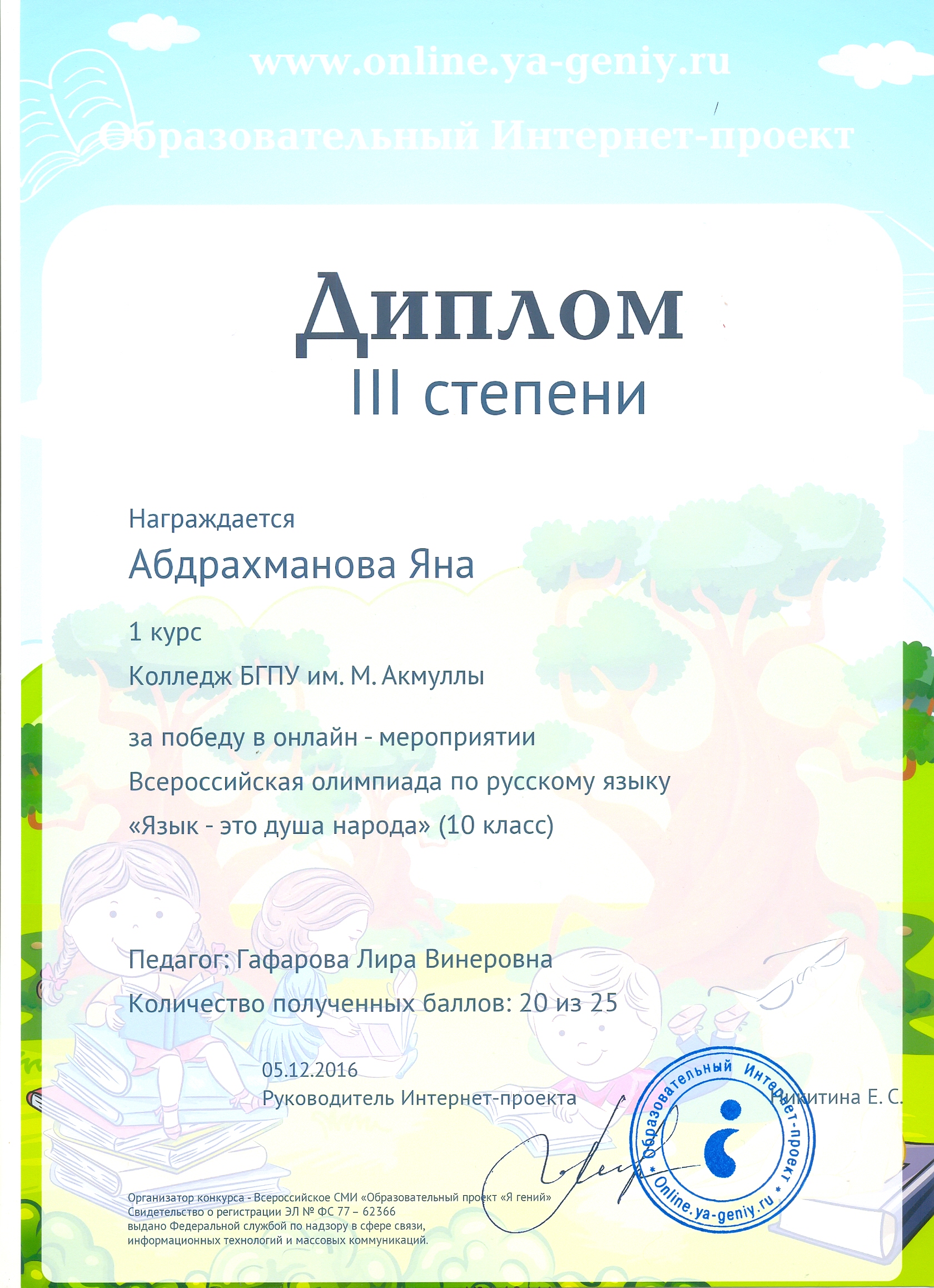 Всероссийская онлайн-олимпиада на сайте «Я - гений»: 3 место в номинации «Язык - это душа народа» Абдрахманова Я. – гр.9Т-11.
