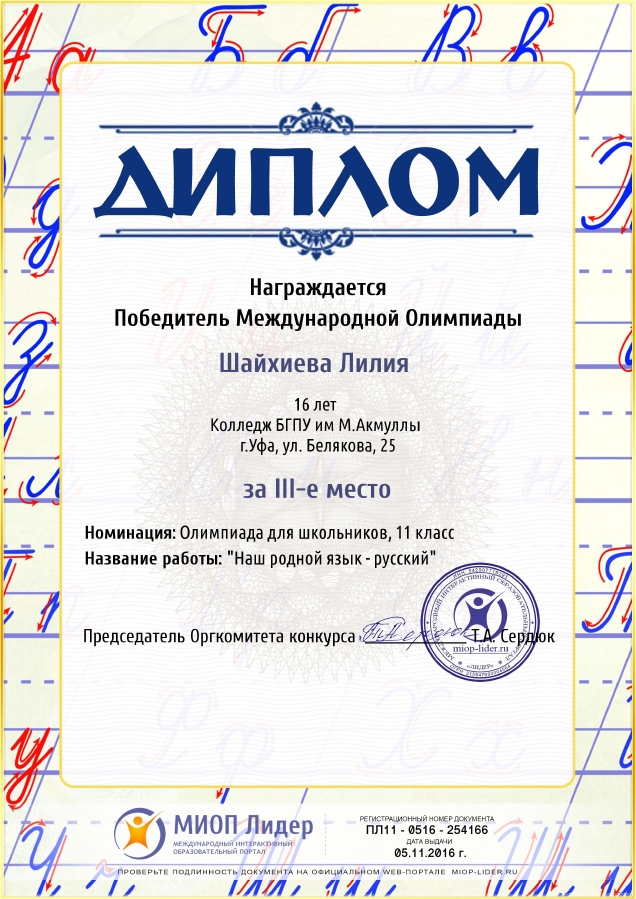 Международная олимпиада для школьников в режиме ОНЛАЙН на Международном интерактивном образовательном портале «Лидер»: 3 место в номинации «Наш родной язык – русский» Шайхиева Л. 9ПО-11. 3 место в номинации «Эрудит русского языка» Морозов И. 9ПО-11.