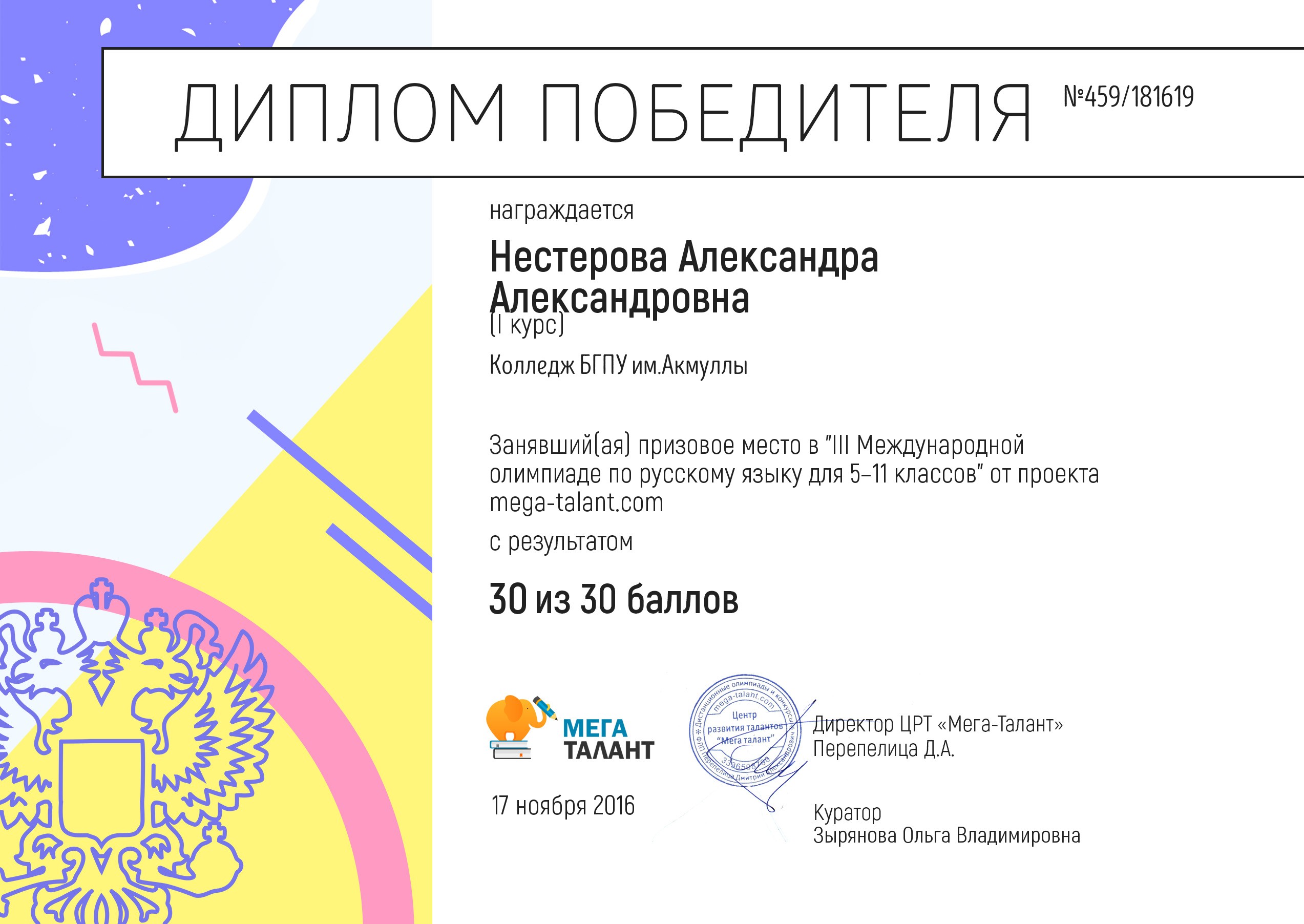 Международная олимпиада по литературе от проекта mega-talant.com: 1 место Нестерова А. – гр.9Т-11.