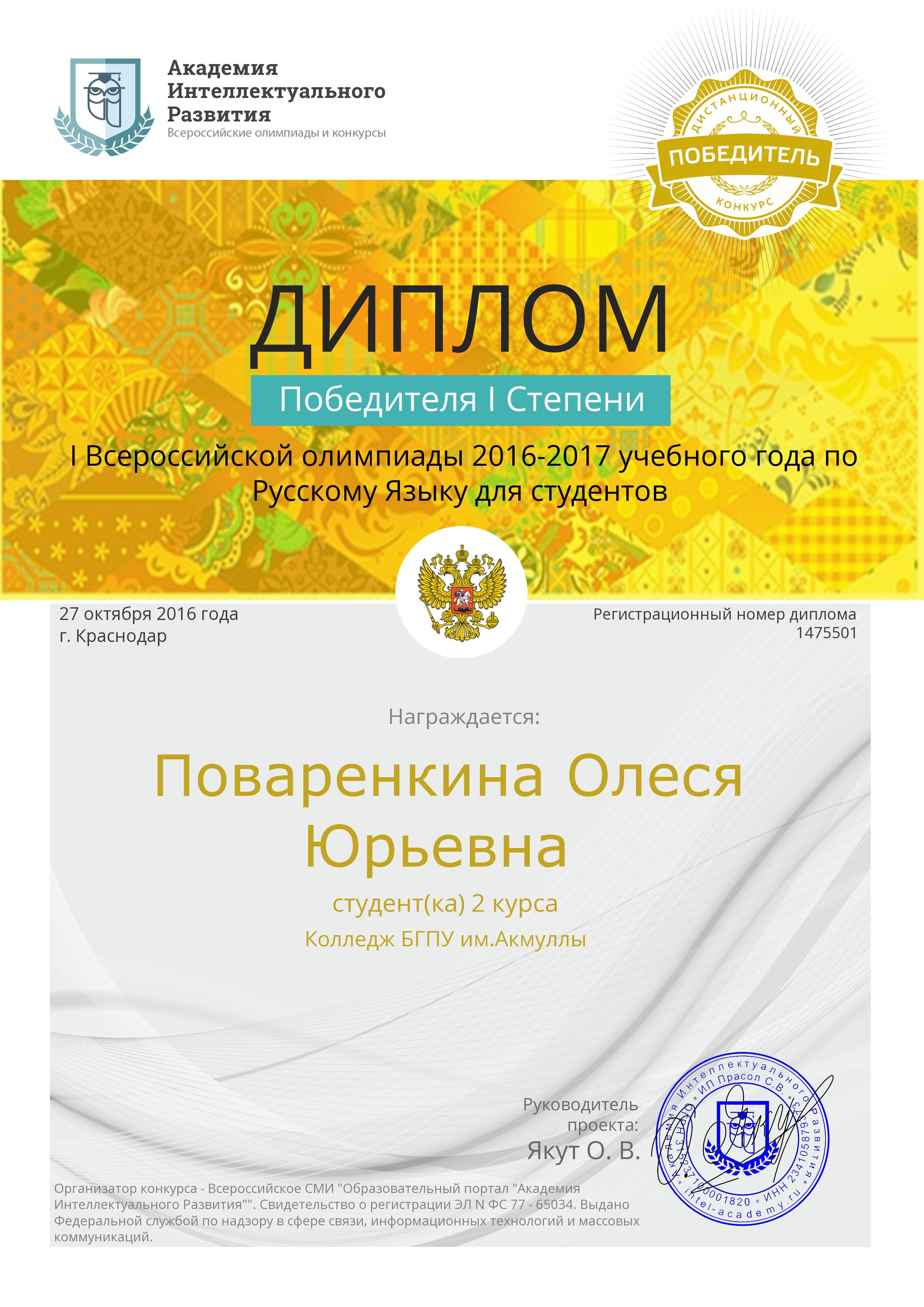 Всероссийская олимпиада по русскому языку для студентов на портале дистанционных проектов «Академия Интеллектуального Развития»: 1 место Поваренкина О. – 9Б-21.