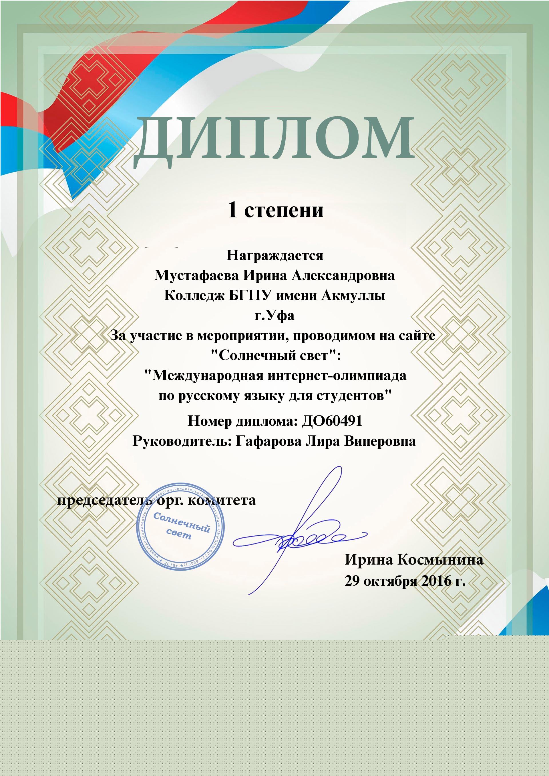 Международная интернет-олимпиада по русскому языку для студентов на сайте «Солнечный свет»: 1 место Мустафаева И. – 9Б-11.