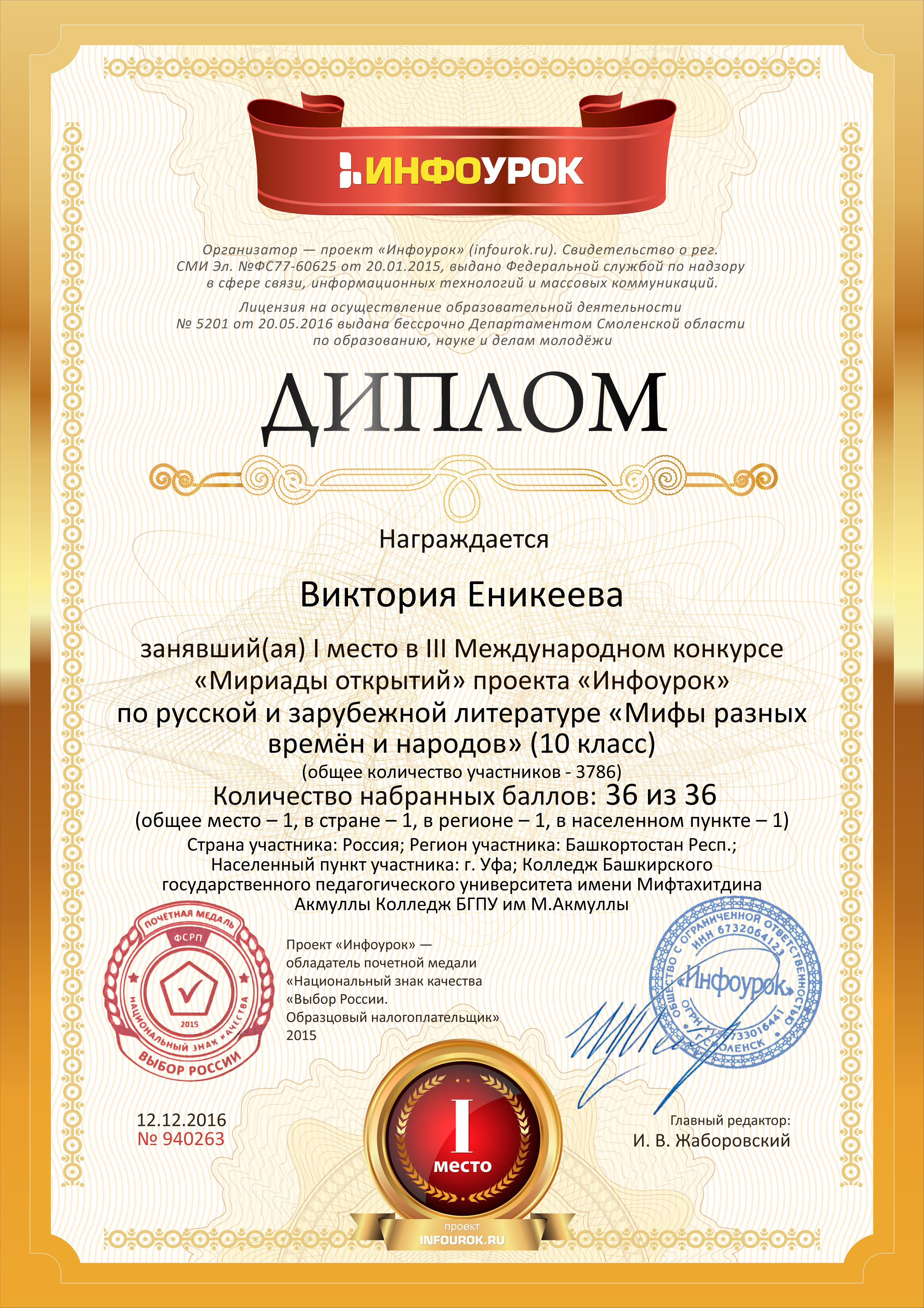 III Международный конкурс «Мириады открытий» проекта «Инфоурок» по русской и зарубежной литературе «Мифы разных времен и народов»: 1 место Еникеева В. – 9Б11.