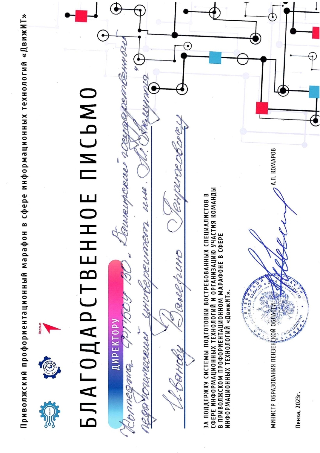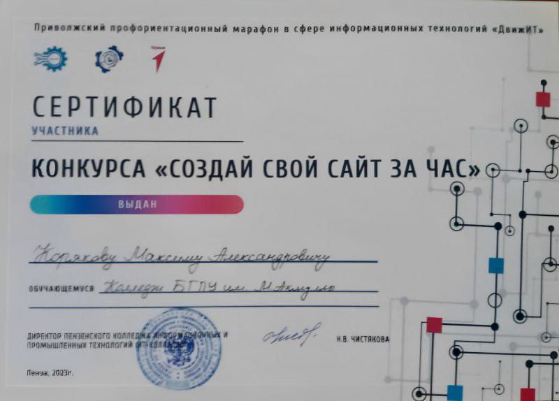 В декабре 2023 года состоялся Приволжский профориентационный Марафон в сфере информационных технологий «ДвижИТ», целями которого были: вовлечь учащихся 8-11 классов и студентов среднего профессионального образования Приволжского федерального округа в сферу информационных технологий, предоставить возможность участникам из реального сектора экономики в сфере IT увидеть практические навыки школьников и студентов, представить потенциальным работодателям перспективные проекты для последующей совместной реализации. Колледж БГПУ им.М.Акмуллы представлял студент  группы 9ИСИП-31-21(25) Коряков Максим (руководитель Нугуманова Р.А.), который принял участие в конкурсе «Создай свой сайт за час», успешно прошел заочный этап, войдя в десятку лучших, и занял 4 место среди студентов Саратова, Пензы, Саранска и Оренбурга. Поздравляем Максима и его руководителя, желаем дальнейших успехов!