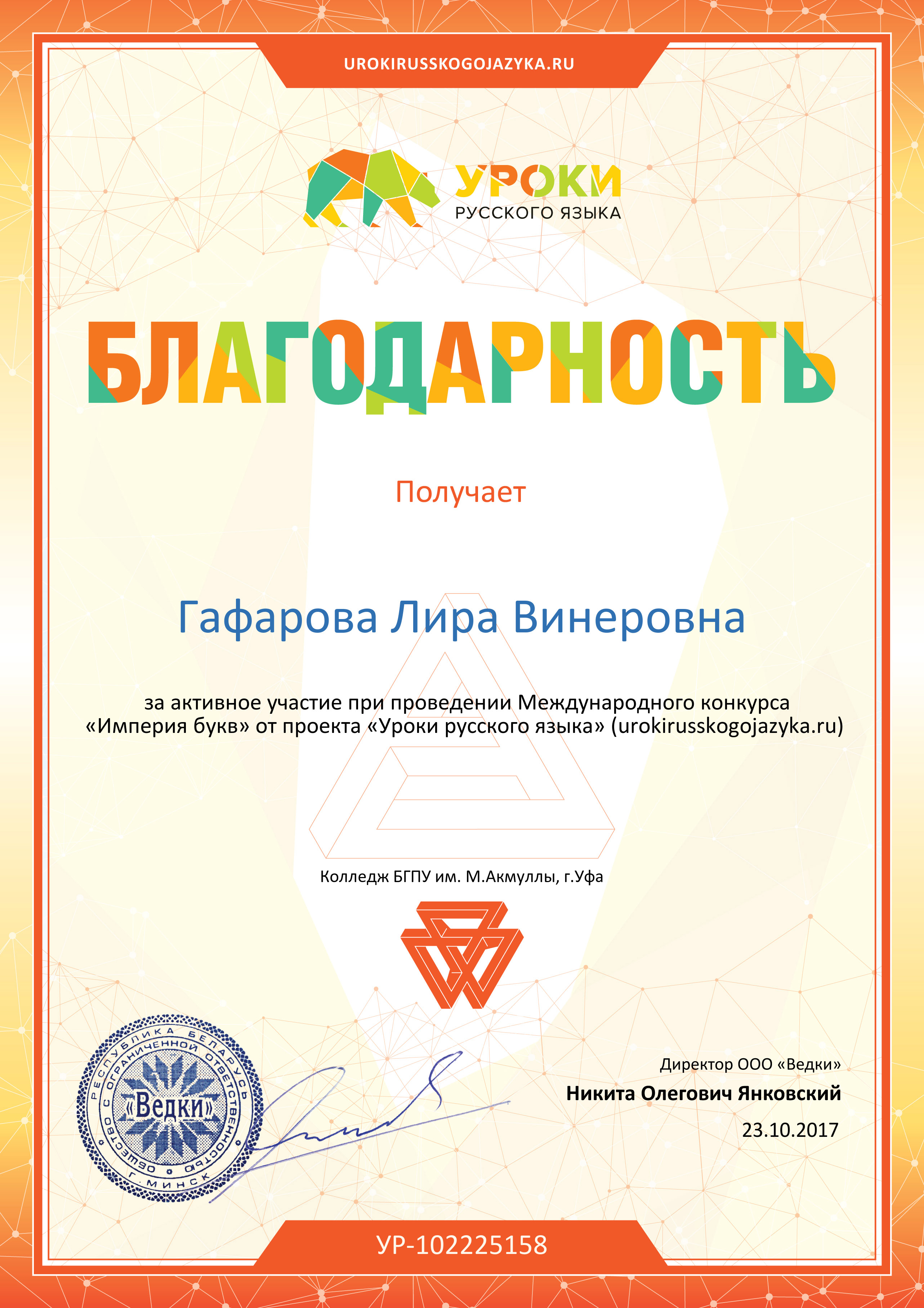 Поздравляем победителей Международного конкурса по русскому языку и литературе  «Империя букв»  (руководитель Л.В.Гафарова) от проекта «Уроки русского языка»: