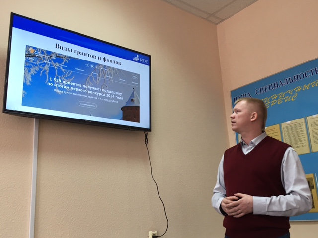 Мероприятие провёл Иванов Алексей Олегович, кандидат исторических наук, преподаватель специальных дисциплин. Студенты узнали о том, что такое грант, как грамотно составить заявку, описать проблему, цель, задачи, календарный план проекта, как его реализовать и развить в дальнейшем. Кроме студентов перечисленных групп, мероприятие посетили также интересующиеся проектной деятельностью студенты других групп и курсов. Ребята активно интересовались основными «тонкостями» при работе с заявками.