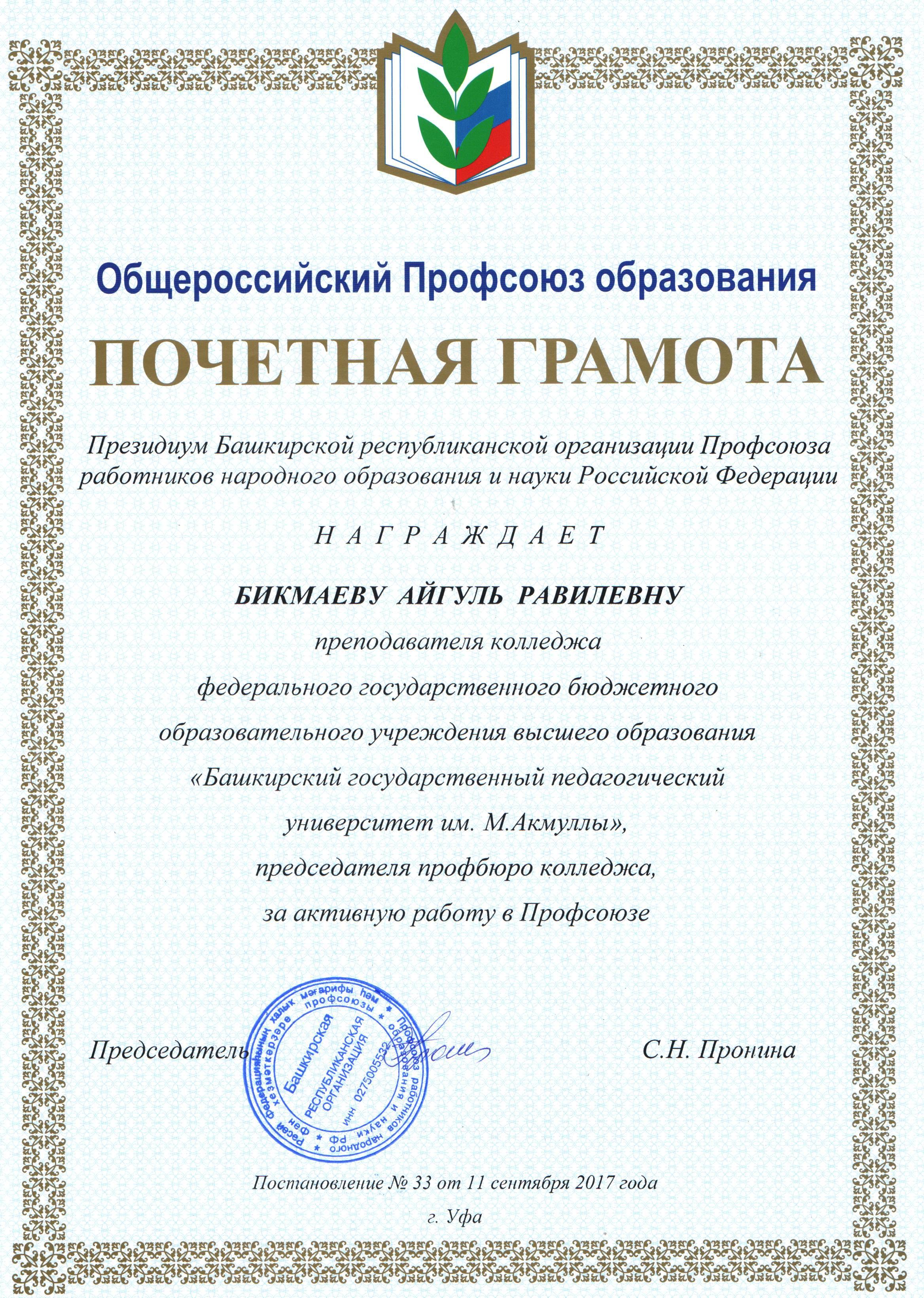 Поздравляем преподавателя Колледжа БГПУ им. М.Акмуллы, председателя профбюро колледжа Бикмаеву Айгуль Равилевну с вручением ей Почетной грамоты Президиума башкирской организации Профсоюза работников народного образования и науки Российской Федерации! Желаем Айгуль Равилевне дальнейшей плодотворной работы и успехов на профессиональном пути!