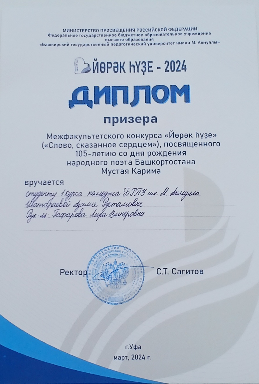 21 марта 2024 г.  в БГПУ им. М. Акмуллы состоялся II тур (очный) Межфакультетского конкурса «Йөрәк һүҙе» («Слово, сказанное сердцем»), посвященного 105-летию со дня рождения народного поэта Башкортостана Мустая Карима, и торжественное награждение победителей конкурса. Цель конкурса – пропаганда и популяризация башкирского языка, повышение общественного интереса к литературному творчеству Мустая  Карима, сплочение, расширение круга интересов студенческой молодежи Акмуллинского университета, содействие в удовлетворении их духовных, интеллектуальных, творческих и социальных потребностей, сохранение и изучение башкирского языка как родного и государственного языка, повышение интереса в вопросе изучения башкирского языка, развитие интереса к изучению и развитию национальной культуры.