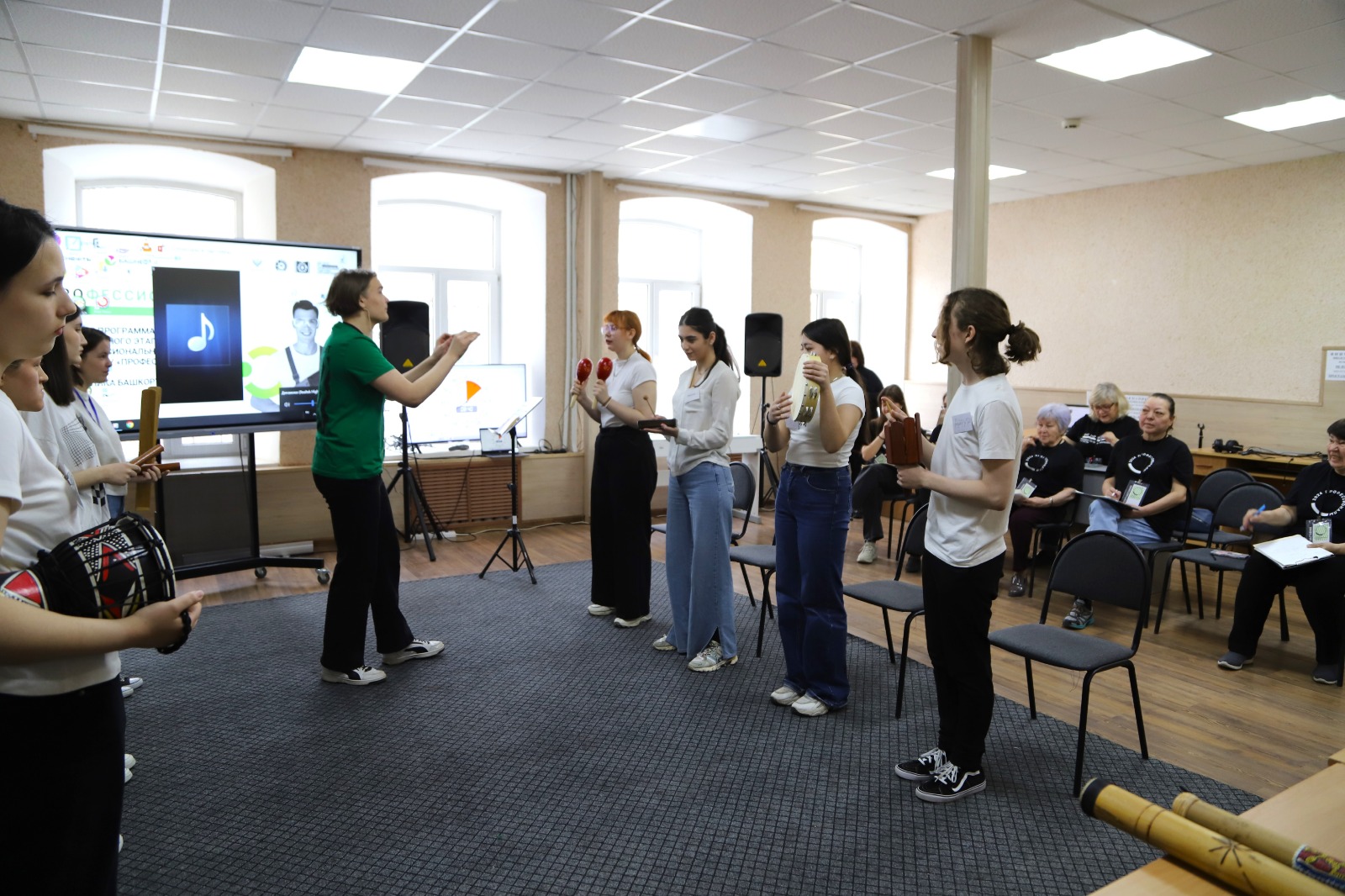 «Оркестр» стал одним из завораживающих модулей чемпионата. Ребята открывали конверты с номерами треков, выбирали предложенные музыкальные инструменты и придумывали ритмические формулы, а  волонтеры Башгоспедуниверситета помогали выступить с импровизацией.
