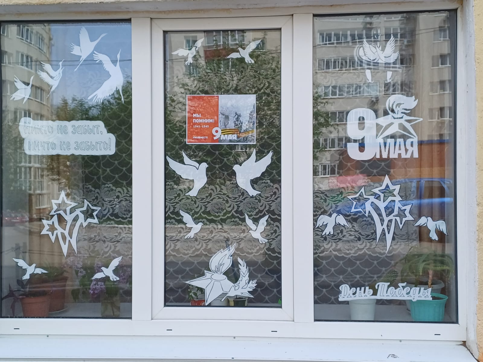 Актив общежития украсил окна,тем самым подтвердили, что помнят о событиях нашей истории и чтят подвиги героев Великой Отечественной войны.