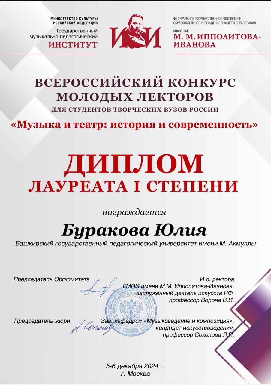 Студентка кафедры музыкального и хореографического образования, выпускница колледжа БГПУ им. М. Акмуллы Юлия Буракова приняла участие во Всероссийском конкурсе молодых лекторов среди творческих вузов, который состоялся в начале декабря в Государственном музыкально-педагогическом институте им. М.М. Ипполитова-Иванова (г. Москва). В 2024 году он был посвящен теме «Музыка и театр: история и современность».