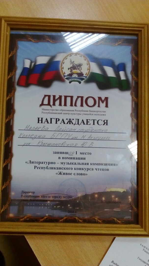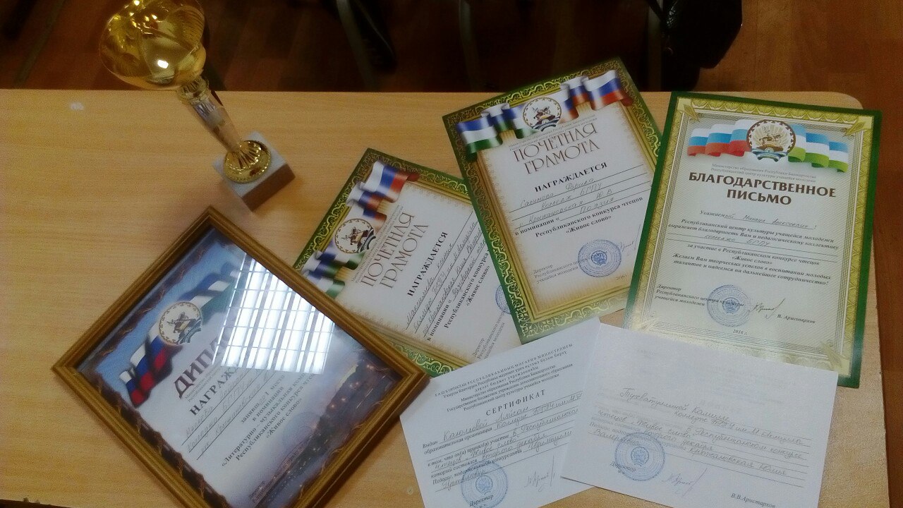 2 декабря 2016 года в Уфимском колледже ремесла и сервиса имени А.Давлетова состоялся республиканский конкурс чтецов «Живое слово». Участие в конкурсе приняли более 100 ребят со всей республики. Не остались в стороне и наши студентки. Под руководством Крыжановской Ю.В. и Идиятуллиной Г.Р. успешно выступили Тухватуллина Камилла 9ИЗО-21, Максимова Ксения 9МО-21, Хабибуллина Камилла 9МО-21, Салимова Фарида , Каюмова Ляйсан 9ГС-11, которые были награждены сертификатами и почетными грамотами. Студентка 2 курса специальности «Музыкальное образование» Малаева Лейсан, стала первой в номинации «Литературно-музыкальная композиция». Желаем дальнейших успехов!