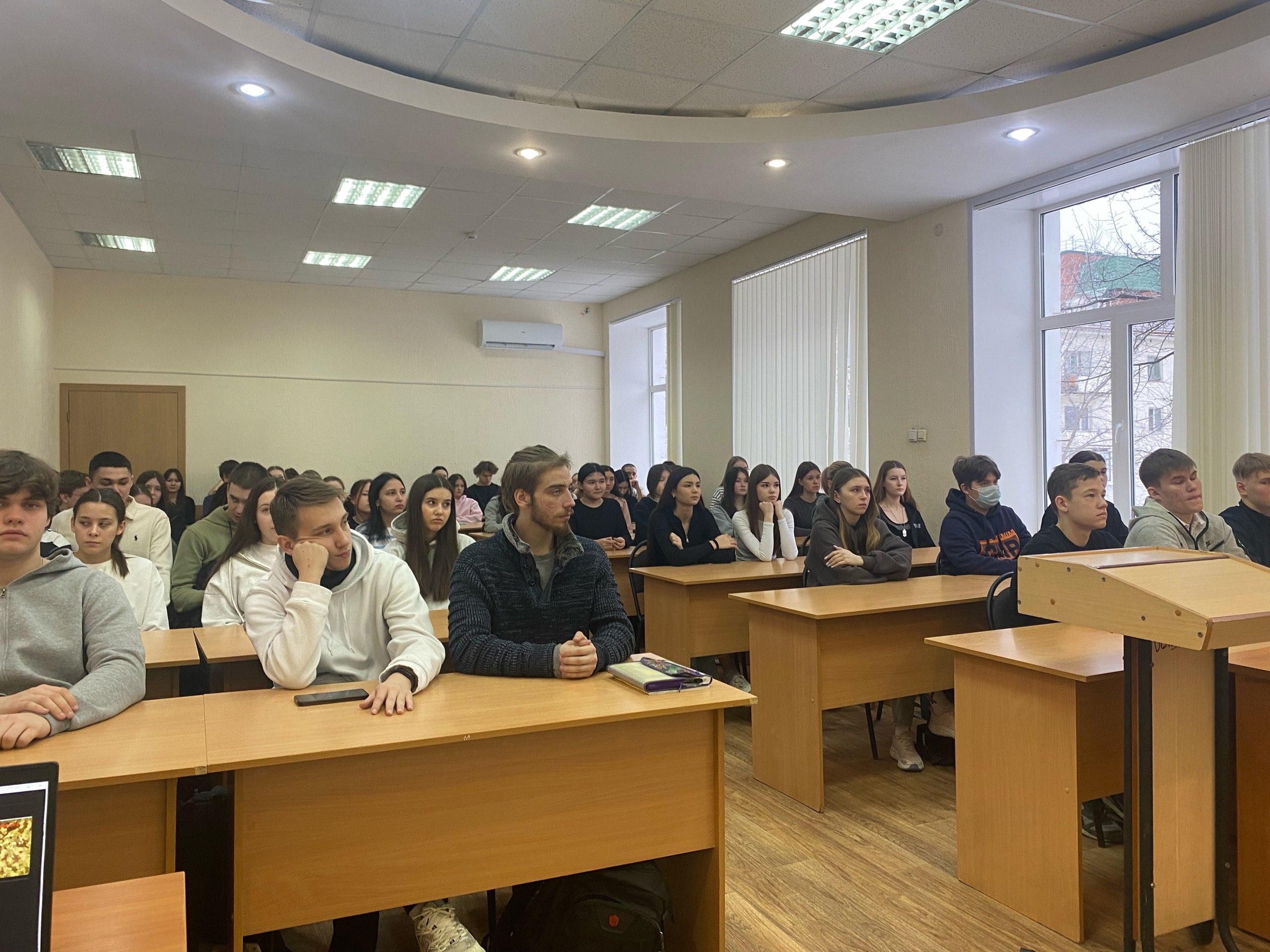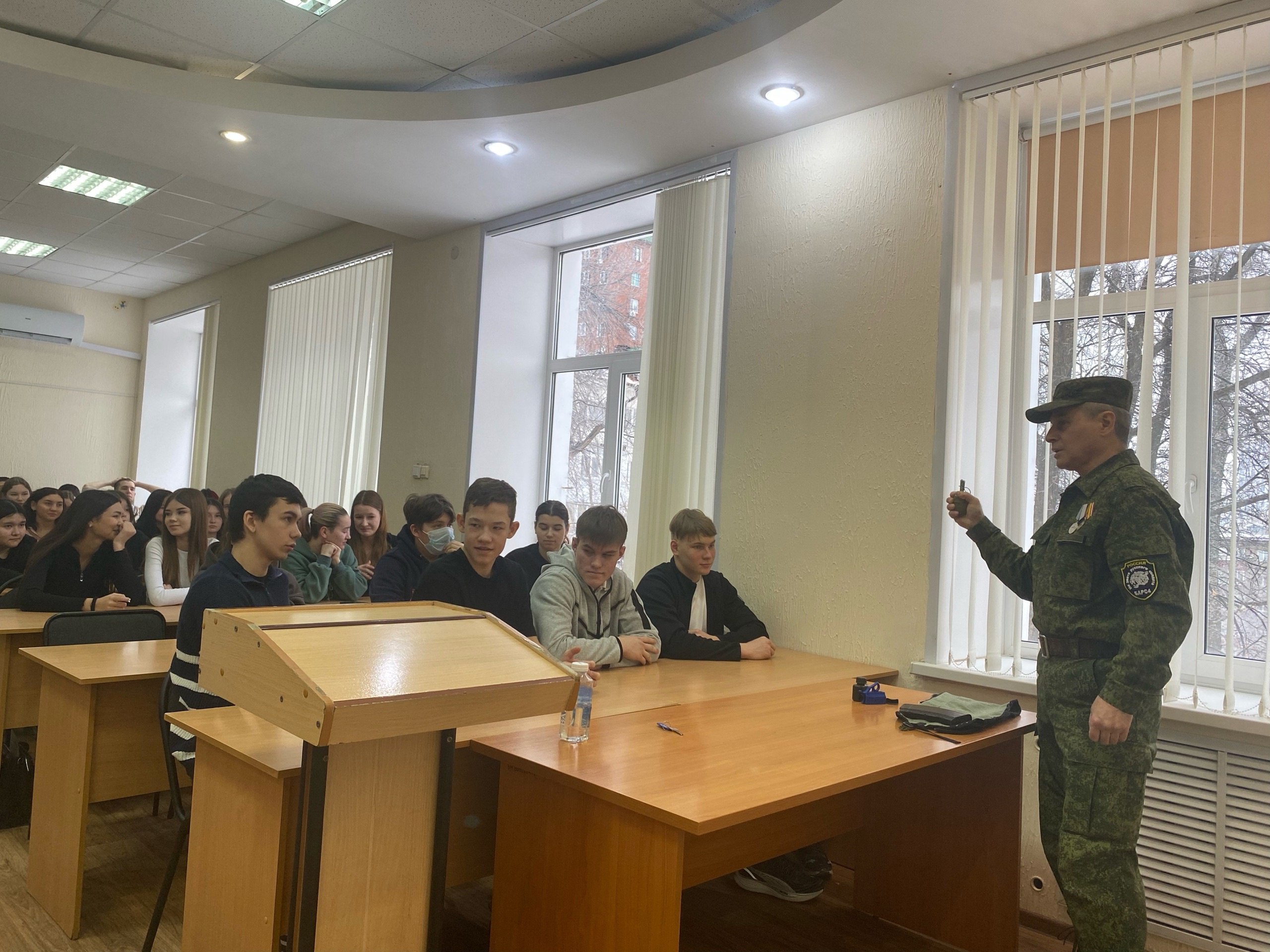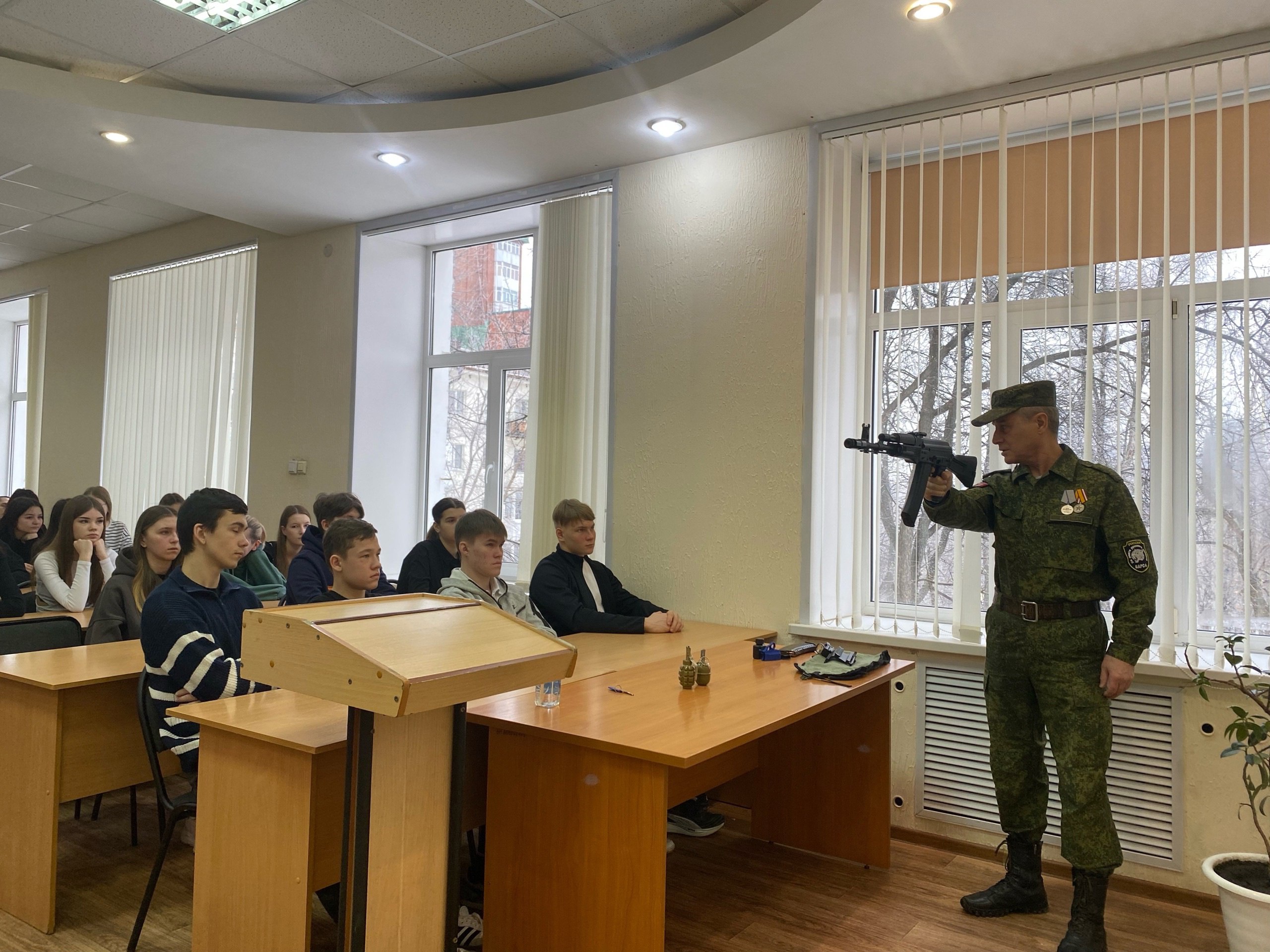 Роберт Даудович рассказал о своем боевом опыте, поделился историями из жизни и напомнил студентам о важности любви к Родине. Он показал презентацию об СВО, ответил на вопросы студентов, касающиеся боевых наград, боев, личной жизни. Ветеран принес с собой специальные приспособления для огнестрельного оружия, гранаты, магазины с боевыми патронами и продемонстрировал студентам, как превратить простой АК-74 в оружие, отвечающий всем требованиям современного боя.