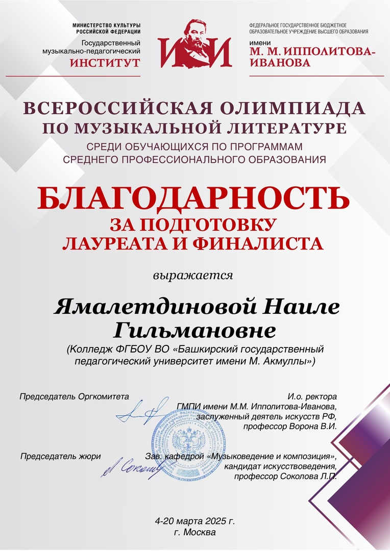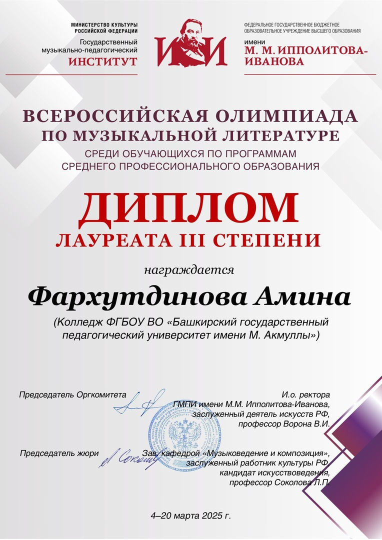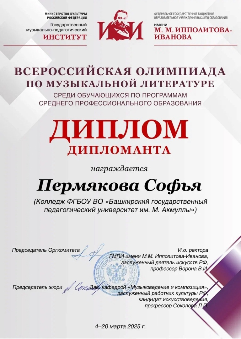 В конце марта 2025 года в Государственном музыкально-педагогическом институте им. М.М. Ипполитова-Иванова (г. Москва) завершилась ежегодная Всероссийская олимпиада по музыкальной литературе среди студентов СПО, включенная в Перечень олимпиад и конкурсов Минпросвещения РФ (приказ № 620 от 30.08.2024).