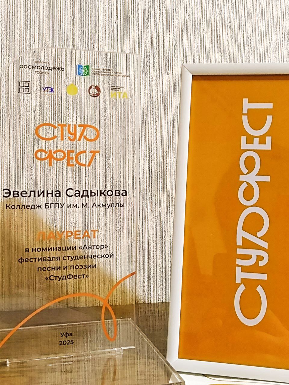Студентка Акмуллинского колледжа, Садыкова Эвелина, одержала победу на фестивале студенческой песни и поэзии «СтудФест»! 16 мая на Гала-концерте были объявлены имена лауреатов, среди которых и Эвелина.