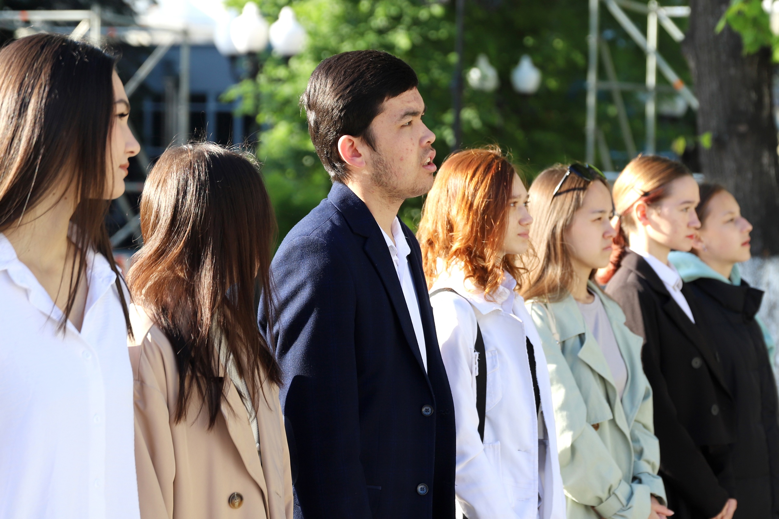 Почетное право поднять флаги было предоставлено студентам Колледжа БГПУ им. М. Акмуллы, имеющим особые достижения в общественной, культурной, научной и учебной деятельности: Янбаевой Лейле, Самысловской Софии-Серафиме, Нормурадовой Динаре и Евдокимовой Анне.
