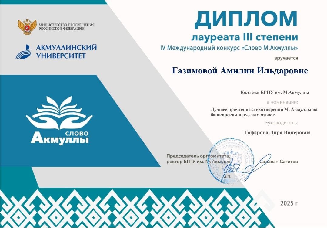 Галима Галина, доцент кафедры башкирского языка и литературы Акмуллинского университета и член жюри номинации «Лучшее прочтение произведений Акмуллы на русском и башкирском языках», особо отметила высокую активность студентов различных учебных заведений среднего профессионального и высшего образования. По ее словам, наибольшую активность проявили студенты Колледжа БГПУ им. М. Акмуллы. Среди отмеченных талантов – Газимова Амилия и Ильясова Камила (руководитель Гафарова Л.В.), которые были награждены дипломами III степени. Поздравляем их с заслуженной победой!
