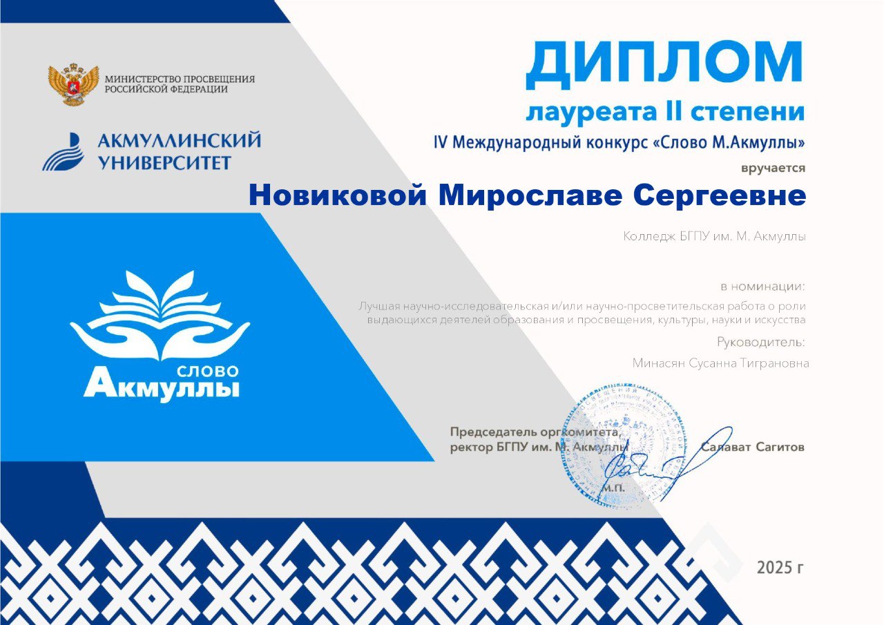 Лауреатами III степени стали студентки Киреева Виктория и Арабова Салиха в номинации «Изобразительное искусство (живопись, графика - работы, посвященные жизни и творческому наследию М. Акмуллы)».